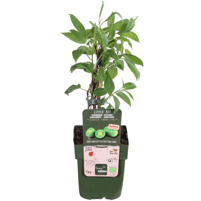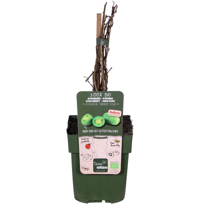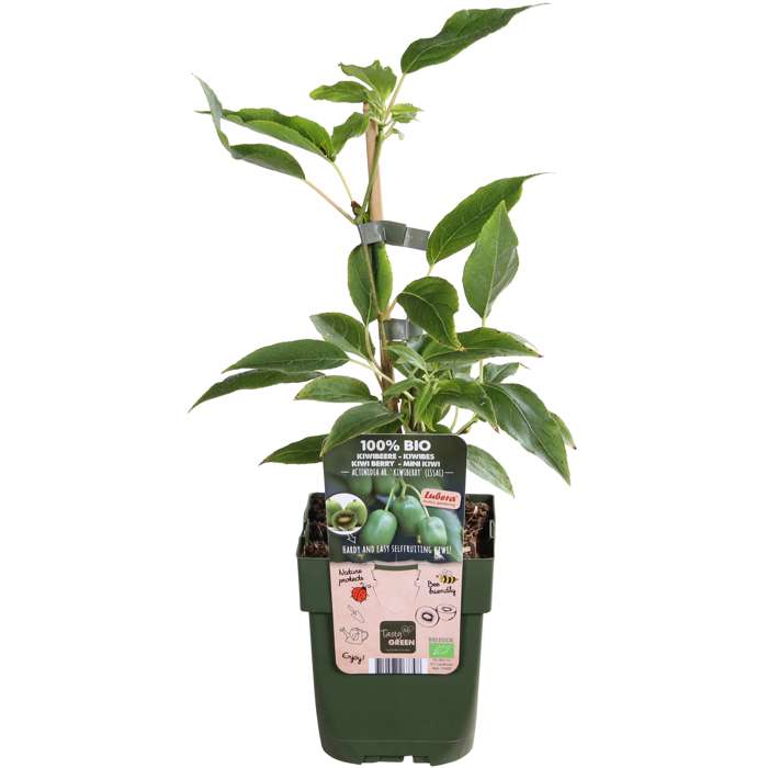 Actinidia Arguta Issai‘ ist eine selbstbestäubende Kiwi-Beere, die schon in jungen Jahren kleine, glatte, unbehaarte Früchte hervorbringt. Sie ist auch als Mini-Kiwi bekannt. Die Früchte können ohne Schälen gegessen werden und sind reich an Vitamin C. Sie hängen in großen Büscheln an der Pflanze, oft getarnt durch die Blätter. Die aufgeschnittene Frucht ähnelt einer Miniatur-Kiwi mit einem weißen Kern, der von einem Ring schwarzer Kerne und dem typischen Linienmuster umgeben ist. Die süßen, grünen Beeren sind im August-September pflückreif und etwa 2 bis 3 cm groß. Die Früchte werden nicht nur frisch angeboten, sondern können auch auf verschiedene Weise verarbeitet werden, z. B. zu Marmelade oder Kompott. Die geschnittenen Früchte eignen sich auch hervorragend als Garnitur für Vorspeisen oder Desserts. Die Früchte werden auch getrocknet und können sogar zur Weinherstellung verwendet werden. Die Kiwitraube ist eine Kletterpflanze, der man am besten hilft, indem man sie an einer Wand, einem Klettergerüst oder einer Pergola entlangführt. Die Blätter der Kletterpflanze sind länglich, oben glänzend dunkelgrün und unten heller grün. Die Kiwitraube blüht im Juni-Juli mit cremeweißen Blüten. Sie ist vollkommen winterhart und kann Temperaturen bis zu -25 °C standhalten. Pflanzen Sie die Kiwi-Pflanze an einen sonnigen, etwas geschützten Platz.