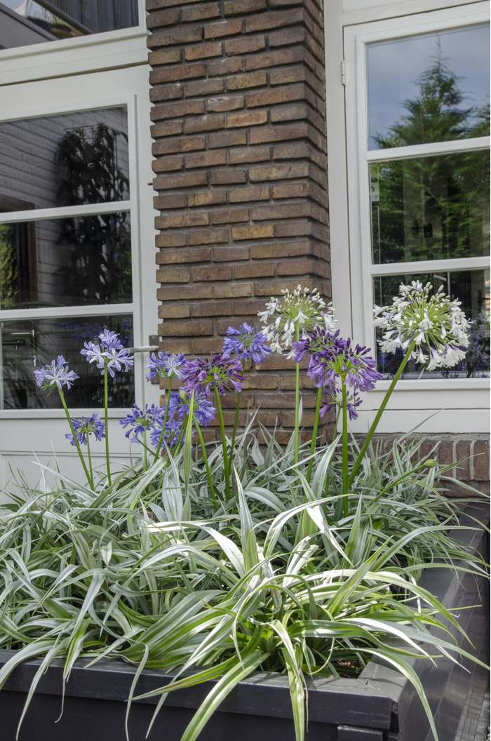 Agapanthus Charlotte ist eine kompakte Pflanze mit violettblauen Blüten an kräftigen Blütenstielen. Sie hat einen reichen Blütenstand und behält ihre Blätter auch im Winter. Diese Agapanthus zeichnet sich durch den dunkelblauen Streifen in der Blüte aus. Die Blüten der Agapanthus enthalten viel Nektar und werden daher oft von Schmetterlingen, Bienen und sogar Vögeln besucht. Der Agapanthus hat eine lange Blütezeit von Juni bis September. Die Pflanze muss nicht beschnitten werden, nur die gelb gewordenen Blätter können abgeschnitten werden. Nach der Blüte können Sie die restlichen Blütenstängel entfernen. Die Pflanze ist sehr widerstandsfähig bis -10 Grad und kann daher den Winter in den Niederlanden problemlos überstehen. Dieser Sonnenliebhaber ist trockenheits- und hitzebeständig und daher leicht zu pflegen. Diese Agapanthus sieht überall gut aus, in einem Pflanzkasten, einer Rabatte oder einfach in einem Topf.