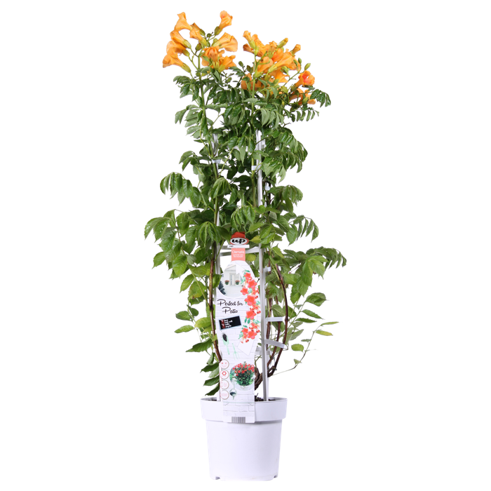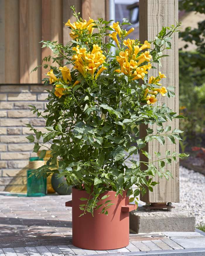Campsis Summer Jazz Gold Trumpet‘ ist eine Kletterpflanze, die bei viel Sonne reichlich und lange blüht. Die Kletterpflanze ist sehr robust, wenn sie an einem geschützten Ort steht. Die gelb blühende Campsis wächst kompakter als andere Arten der Summer Jazz-Serie und erreicht eine maximale Höhe von 3 Metern. Der Spätsommerblüher neigt dazu, einen Strauch zu bilden. Wenn Sie möchten, dass Ihre Campsis klettert, ist es sinnvoll, sie zu Beginn ihres Wachstums mit einem Klettergerüst zu unterstützen. Diese Campsis ist eine selbsthaftende Kletterpflanze, was bedeutet, dass sich an den Zweigen kleine Haftwurzeln bilden. Diese Haftwurzeln setzen sich an der Wand oder am Zaun fest. Im August und September erwarten Sie exotische Blüten, die Ihrem Außenbereich eine mediterrane Atmosphäre verleihen. Die Blüten sind bei Schmetterlingen, Bienen und Insekten sehr beliebt.