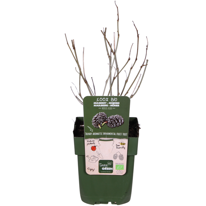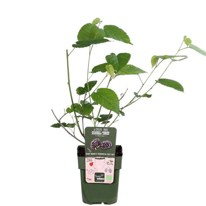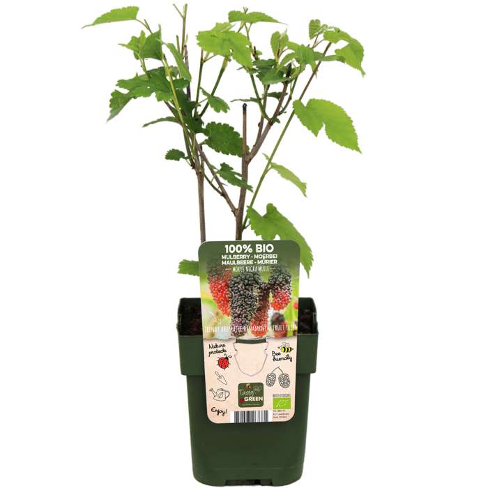 Morus Nigra Mulle‘ ist eine schwarze Maulbeere. Der Baum ist durch seine Äste und seine dunkelgrünen, herzförmigen Blätter sehr charakteristisch. Im Mai blüht der schwarze Maulbeerbaum mit einer weißen Blüte. Im Herbst erscheinen rote und schwarze Früchte an den Zweigen. Sie sind zunächst grün, werden dann rot und sind bei Vollreife schwarz und rot. Sie ähneln Himbeeren und schmecken leicht süß und aromatisch. Die Früchte sind gesund und enthalten viele Ballaststoffe, Vitamine und Antioxidantien. Man kann sie frisch essen, trocknen oder zu Marmelade und Saft verarbeiten. Der Maulbeerbaum wächst langsam und trägt meist erst nach einigen Jahren Früchte. Die Bäume können sehr alt werden, 100 Jahre und mehr. Je nachdem, wie man ihn beschneidet, kann der Maulbeerbaum so groß werden, wie man will, so dass er auch für den etwas kleineren Garten geeignet ist. Beim Beschneiden werden die kleinen unteren Äste des Baumes entfernt und große Äste, die die Form des Baumes stören würden, entfernt. Halten Sie die Krone offen, damit Licht in sie hineinfallen kann. Sie können den Maulbeerbaum auch in einem Topf auf der Terrasse oder dem Balkon pflanzen. In einem Blütentopf ist die Maulbeere jedoch frostempfindlicher. Deshalb ist es sinnvoll, den Topf im Winter mit Luftpolsterfolie einzuwickeln. Maulbeeren wachsen am besten in der Sonne und in feuchtigkeitsbewahrenden Böden.