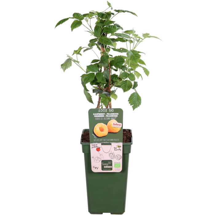 Rubus Autumn Amber‘ ist eine besondere Herbsthimbeere, da die Früchte gelb gefärbt sind. Sie schmecken etwas weicher und süßer als die bekannten rosa Himbeeren. Im Juni blüht der Strauch mit unauffälligen, kleinen weiß-rosa Blüten. Die Blüten werden von Bienen und Hummeln bestäubt, so dass man nur eine Pflanze braucht, um Früchte zu bekommen. Im Laufe des Sommers bis Oktober können die gelben Himbeeren geerntet werden. Sie sind besonders schmackhaft, wenn sie direkt vom Strauch gegessen werden, da diese weichen Früchte nicht so lange haltbar sind. Die Frucht ist sehr gesund, da sie reich an Antioxidantien, Mineralien und Vitaminen ist. Nach der Ernte ist es ratsam, die Zweige, die Früchte getragen haben, zu entfernen, damit im neuen Jahr neue junge Zweige wachsen können.