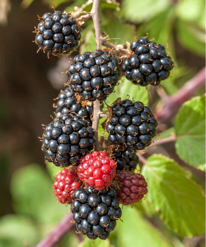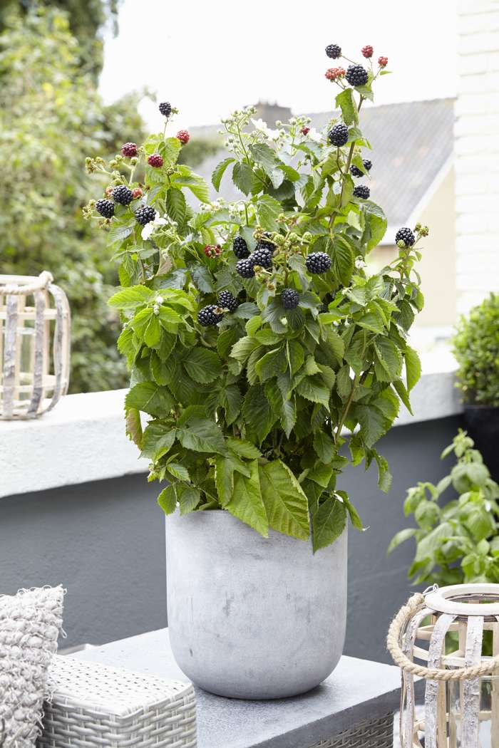Rubus Niedrig. Little Black Prince‘ ist eine schwarze Zwergbrombeere. Da es sich um eine kleine Brombeere handelt, kann man sie auch in einem Topf auf der Terrasse oder dem Balkon anbauen. Der Strauch hat dunkelgrüne, ovale, gezackte Blätter. Die Früchte haben ein gutes Aroma, schmecken süß und frisch. Brombeeren sind zunächst grün, dann werden sie rot und schließlich nehmen sie diese schöne dunkelviolett-schwarze Farbe an. Brombeeren können über einen langen Zeitraum gepflückt werden, von Juli bis Oktober.