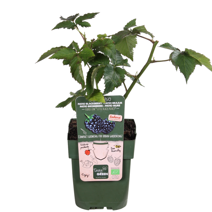 Rubus Niedrig. Little Black Prince‘ ist eine schwarze Zwergbrombeere. Da es sich um eine kleine Brombeere handelt, kann man sie auch in einem Topf auf der Terrasse oder dem Balkon anbauen. Der Strauch hat dunkelgrüne, ovale, gezackte Blätter. Die Früchte haben ein gutes Aroma, schmecken süß und frisch. Brombeeren sind zunächst grün, dann werden sie rot und schließlich nehmen sie diese schöne dunkelviolett-schwarze Farbe an. Brombeeren können über einen langen Zeitraum gepflückt werden, von Juli bis Oktober. Die Zweige, von denen Sie die Früchte gepflückt haben, können Sie bereits beschneiden; diese Zweige werden im nächsten Jahr wieder Früchte tragen. Lassen Sie die neuen Zweige in Ruhe, sie werden später in der Saison Früchte tragen. Regelmäßiges Beschneiden verhindert auch die Ausbreitung von Krankheiten.