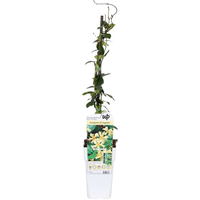 Trachelospermum Star of Toscana‘ wird wegen seiner zartgelben, sternförmigen Blüten auch Sternjasmin genannt. Sie ist eine mediterrane, immergrüne Kletterpflanze und bis -10˚C winterhart. Die üppige Blütezeit dauert von Anfang Juni bis Ende August. In dieser Zeit verbreiten die Blüten einen herrlich süßen Duft. Die Kletterpflanze hat ovale, dunkelgrüne Blätter und braucht für ein gutes Wachstum die Unterstützung eines Klettergerüsts oder Zauns. Die neuen Zweige dieses Sternjasmins rollen sich schön entlang eines Maschendrahtes oder Zauns auf. Der beste Platz ist in der Sonne bis zum Halbschatten und außerhalb des Windes. Sternjasmin kann in normalem, nährstoffreichem Boden in die Erde gepflanzt werden. Sternjasmin wächst auch gut in einem großen Topf auf der Terrasse oder dem Balkon. An einem sonnigen Platz kann sie auch als Bodendecker verwendet werden. Die Kletterpflanze kann Trockenperioden recht gut überstehen, aber in heißen und trockenen Perioden können Sie ihr zusätzlich Wasser geben. Ein Rückschnitt ist nur notwendig, um die Pflanze in die richtige Form zu bringen. Am besten ist es, dies im zeitigen Frühjahr oder nach der Blütezeit zu tun. Sternjasmin wächst relativ langsam und es dauert einige Jahre, bis er seine maximale Höhe erreicht.