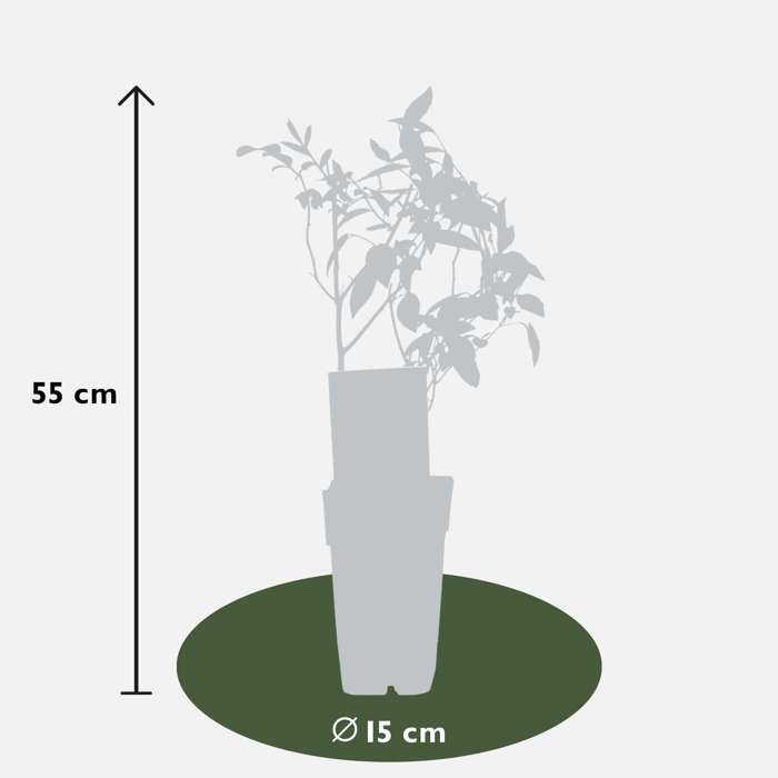 Vaccinium Corymbosum Goldtraube 71′ ist eine Heidelbeere, auch Amerikanische Heidelbeere genannt. Der Strauch wird etwa 1,5 bis 2 Meter hoch und 150 cm breit und wächst nur auf sauren Böden. Sandige und torfhaltige Böden sind sauer und daher für diese Pflanze geeignet. Wenn Sie die Pflanze in Lehmboden setzen wollen, müssen Sie saure Erde hinzufügen, damit die Pflanze überleben kann. Sie hat dünne Zweige und kleine, frischgrüne Blätter. Die Blaubeere blüht in Büscheln und die Blüte ist cremeweiß bis rosa gefärbt. Die Blüte erfolgt in der ersten Maihälfte. Sie ist eine kräftige Pflanze, die sehr viele Früchte trägt. Die Beeren sind mittelgroß, hellblau, fest und haben einen köstlichen Geschmack. Sie enthalten viele Antioxidantien, also super gesund! Sie können von Mitte Juli bis Mitte August gepflückt werden. Frische Heidelbeeren sind eine Woche lang haltbar, können aber auch eingefroren werden. Diese Pflanze ist selbstbestäubend und benötigt fast keine Pflege. Schützen Sie die Beeren mit einem Netz vor Vögeln. Die Pflanze ist widerstandsfähig und resistent gegen Krankheiten.