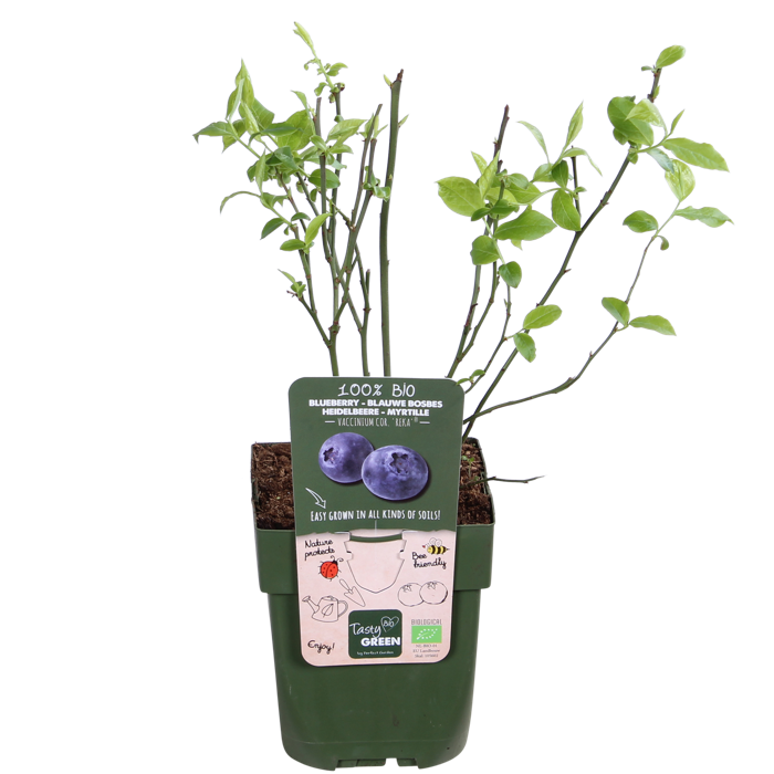Vaccinium corymbosum Reka‘ ist auch als Heidelbeere bekannt. Sie ist eine bekannte Sorte, die viele, große und süße Früchte hervorbringt. Sie wächst auf allen Böden gut. Der Strauch hat dünne Zweige und kleine, frischgrüne Blätter. Die Früchte sind fest, hellblau und haben einen guten Geschmack. Sie können von Mitte Juli bis Mitte August gepflückt werden. Frische Blaubeeren sind eine Woche lang haltbar, und man kann sie auch einfrieren. Die Heidelbeere blüht in Büscheln, und die Blüte ist cremeweiß bis rosa gefärbt. Die Blüte erfolgt in der ersten Maihälfte. Diese Pflanze ist selbstbestäubend und benötigt fast keine Pflege. Die Blätter haben eine schöne orange-rote Herbstfärbung und fallen dann ab. Blaubeeren haben medizinische Eigenschaften. Die Beere enthält Anthocyane, eine Substanz, die der Beere ihre blaue Farbe verleiht. Dieser Stoff hat eine gute Wirkung auf das Herz und die Blutgefäße. Die Färbung kann unter anderem dafür sorgen, dass Fettansammlungen in den Blutgefäßen reduziert werden, was die Durchblutung verbessert. Darüber hinaus enthalten Heidelbeeren Antioxidantien.