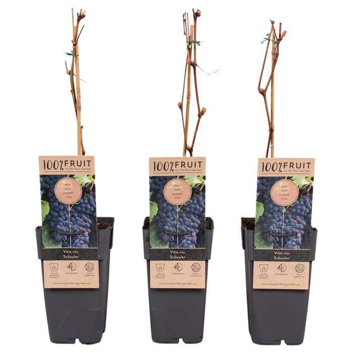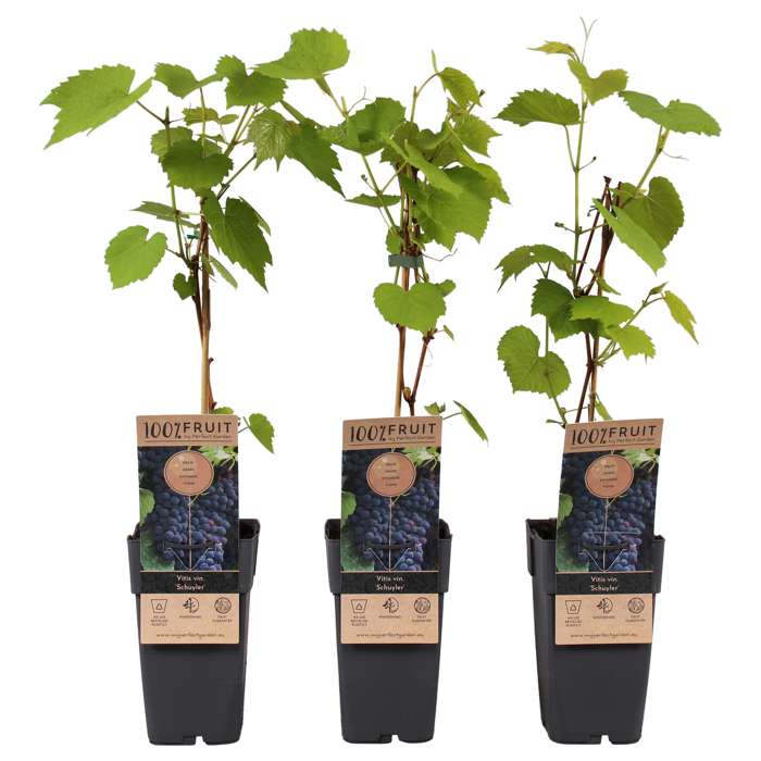 Vitis Schuyler‘ ist eine blaue Traube, die seit Tausenden von Jahren angebaut wird. Die Römer führten diese Art in Nordwesteuropa ein. Sie ist eine Kletterpflanze, die mehrere Meter hoch werden kann. Man kann ihn in alle möglichen Formen bringen und ihn durch einen guten Schnitt sehr kompakt halten. Sie können die Traube einfach entlang einer Pergola oder an einer Wand mit Spanndrähten führen. Die Traube bildet im Mai-Juni zunächst unscheinbare Blütentrauben aus, aus denen sich dann die Trauben bilden. Die Früchte haben eine blaue Farbe und einen süßen, aromatischen Geschmack. Man kann sie direkt essen oder zu Marmelade, Saft oder Wein verarbeiten. Die Traubenpflanze braucht viel Sonne, um zu reifen, und liebt die Wärme, so dass ein nach Süden ausgerichteter Standort ideal ist. Die Trauben können ab Mitte September geerntet werden. Der Boden sollte gut durchlässig und nährstoffreich sein und möglichst nicht zu sauer, sondern eher kalkhaltig. Das Beschneiden erhöht den Fruchtertrag und die Pflanze sieht auch schöner aus. Am besten ist es, die Pflanze zwischen November und Februar zu beschneiden, aber nicht bei strengem Frost. Überflüssige Seiten- und Hauptäste beschneiden. Diese Rebsorte ist winterhart und verträgt problemlos Temperaturen bis zu -20 Grad.