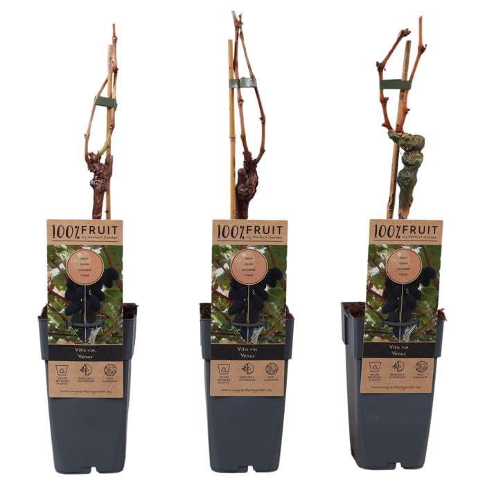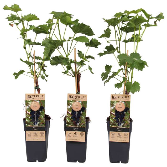 Vitis Venus’ is a seedless blue grape, suitable both for fresh consumption and as a wine grape. This variety has extra large fruits and is therefore a very good wine grape. It is a climbing plant that can grow several metres high. You can lead it into all kinds of shapes and keep it very compact by pruning it well. You can easily lead the grape along a pergola or on the wall with bungee cords. The grape first produces inconspicuous clusters of flowers in May-June, after which the grape bunches will form. The fruits are blue, with a sweet aromatic taste. You can eat them directly or use them to make jam, juice or wine. The grape plant needs plenty of sun to ripen and loves heat so a south-facing location is ideal. The grapes can be harvested from mid-September onwards. The soil should be well-drained and nutritious and preferably not too acidic, but rather calcareous. Pruning increases the fruit yield and the plant also looks neater. It is best to prune the plant in the period between November and February, but not during severe frost. Prune superfluous side and main branches. This grape variety is Hardy and can withstand temperatures up to -20 degrees.