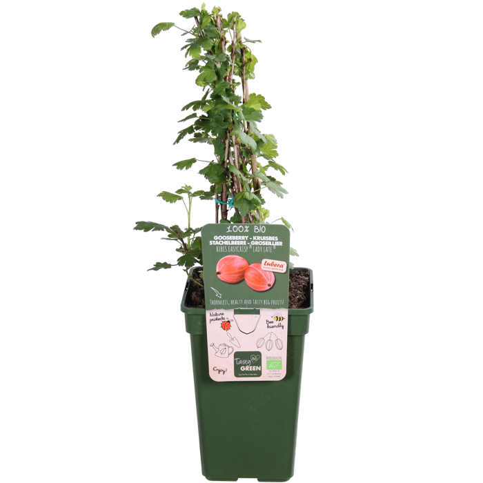 ‘Ribes Easycrisp Lady Late’ is a gooseberry that produces fresh sweet fruits. The advantage of this shrub is that it has fewer prickles on the branches compared to other gooseberry species. This makes it easier to pick the fruit. This red gooseberry blossoms in April with green-white flowers and around July the fruits are ready to be picked. The fruits are extra large, round and dark red. It is not a common shrub to grow at home, but it is a very easy plant for the starting fruit gardener or for children who like gardening. The gooseberry is good for making jam or wine. In the winter, this bush loses its leaves and that is the best time for pruning. Without leaves, the bush can best be seen and so you can prune it back into the desired shape. This red gooseberry prefers a spot in the sun in soil that is not too damp. Gooseberries need support to grow. It is therefore advisable to tie the stems along a climbing frame or mesh.