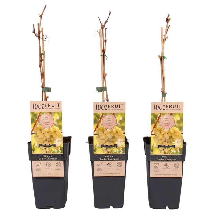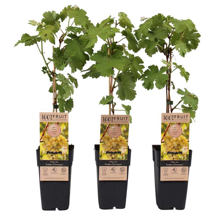 Vitis Golden Champion’ is a white grape plant and flowers very early. This plant is not self-pollinating and thus needs another plant to get fruit. The grape is often combined with ‘Vitis Frankenthaler’ for pollination. Due to its very early flowering, this variety is best kept in the greenhouse to prevent the flowers from freezing. It is a climbing plant that can grow several metres high. You can lead it into all sorts of shapes and keep it very compact by pruning it well. You can easily lead the grape along a pergola or on a wall with tension wires. The grape first produces inconspicuous clusters of flowers in April-May, after which the grape bunches will form. The fruits are yellow-green, sweet, juicy with a good aroma. You can eat them directly or use them to make jam, juice or wine. The grape plant needs plenty of sun to ripen and loves heat so a south-facing location is ideal. The grapes can be harvested from mid-September onwards. The soil should be well-drained and nutritious and preferably not too acidic, but rather calcareous. Pruning increases the fruit yield and the plant also looks neater. It is best to prune the plant in the period between November and February, but not during severe frost. Prune superfluous side and main branches. This grape variety is Hardy and can withstand temperatures up to -20 degrees.