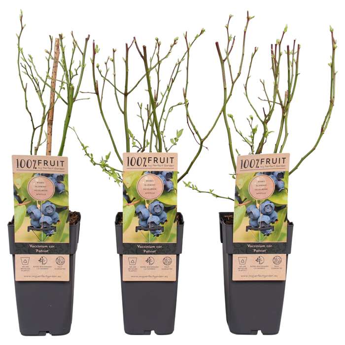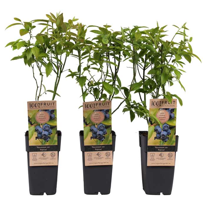 Vaccinium Corymbosum Patriot’ is also known as blueberry or American blueberry. It is a vigorous growing shrub that requires little maintenance. It produces large, dark blue berries with a fresh sweet taste. The plant prefers a sunny spot and needs an acid soil to grow. Otherwise, the plant will not produce much fruit and may even die. The blueberry blooms in May with white-pink flowers which then turn into berries. The start of the picking season is in July. In the autumn, the leaves change to a beautiful red colour, after which it loses its leaves. The blue berries contain anthocyanin, a substance that gives the berry its blue colour. This substance has a good effect on the heart and blood vessels. The colouring agent can, among other things, ensure that fat accumulation in the blood vessels is reduced, which improves the blood circulation. In addition, blueberries contain antioxidants. These play an important role in the ageing process. Antioxidants have an anti-inflammatory effect, lower cholesterol and protect against various diseases, such as cancer. In short, a super healthy berry that everyone wants in their garden!