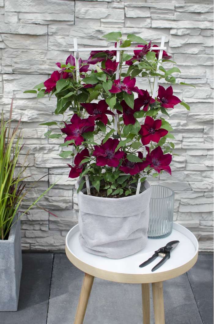 A very special Clematis that flowers throughout the summer. From May to September you can enjoy its large red umbels. The Clematis provides an oasis of flowers in its first year. Unlike most Clematis species that flower for one to two months, ‘Nubia’ can be enjoyed for up to five months. On a pergola or climbing frame, ‘Nubia’ will grow to a maximum height of 180 cm. This clematis prefers a spot in the (semi-) full sun. The most ideal location is in the morning and/or evening sun. Because ‘Nubia’ is a compact variety, it can also be placed in a pot on a balcony, terrace or even in a hanging basket. In order for the Clematis to climb better, it needs a little help. The best way is to guide the plant along a rack, wire or stick. Pruning is not necessary. However, remove dead and damaged twigs in early March. You can prune this Clematis in the spring to a maximum height of 20 centimetres above the ground.