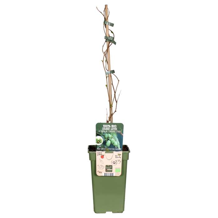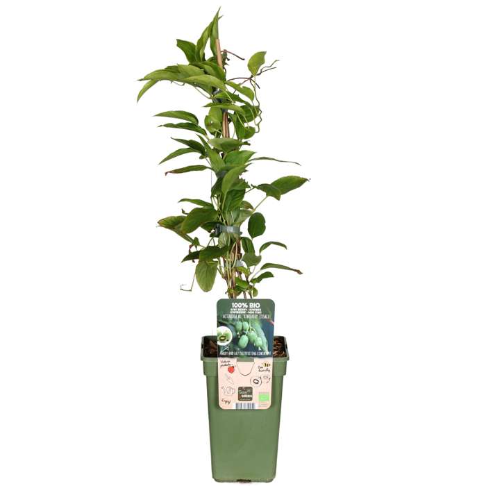 ‘Actinidia arguta Kiwiberry Issai’ is a self-pollinating kiwiberry that produces small, smooth, hairless fruits at a young age. It is also known as mini-kiwi. The fruits can be eaten without peeling and are rich in vitamin C. They hang in large clusters on the plant, often camouflaged by the leaves. The cut fruit resembles a miniature kiwi, with a white core surrounded by a ring of black seeds and the typical pattern of lines. The sweet, green berries are ready for picking in August-September and are about 2 to 3 cm in size. Apart from being fresh, the fruits can also be processed in various ways, such as jam or compote. The cut fruits are also beautiful as a garnish for appetizers or desserts. The fruits are also dried and can even be used to make wine. The kiwi grape is a climbing plant and therefore you can best help it by guiding it along a wall, climbing frame or pergola. The leaves of the climber are oblong, shiny dark green above and lighter green below. The kiwi grape flowers in June-July with creamy white flowers. It is completely winter Hardy and can withstand temperatures up to -25 °C. Plant the kiwi plant in a sunny, somewhat sheltered spot.