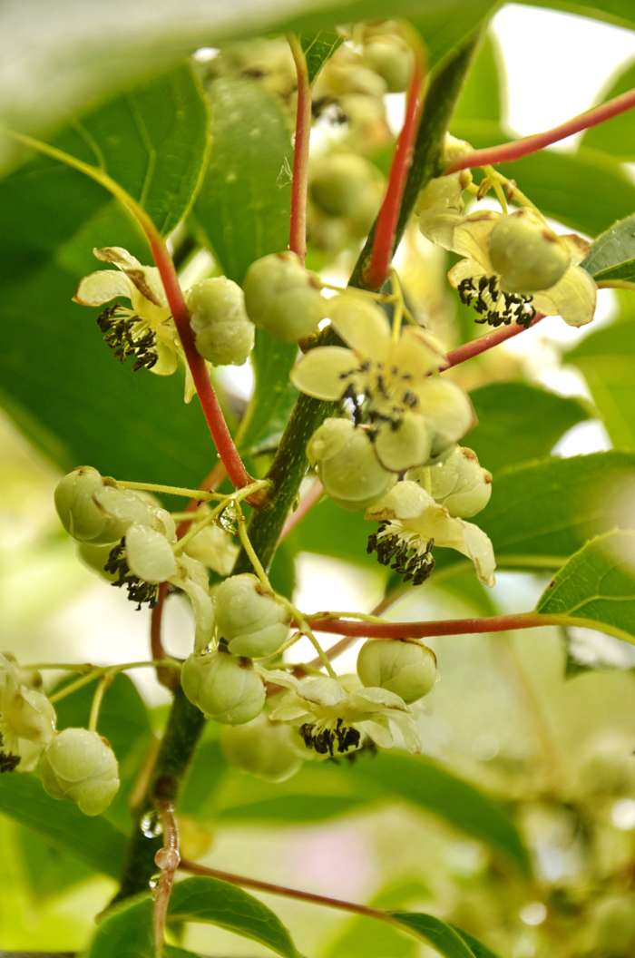 Actinidia arguta Weiki’ is a kiwi grape also known as mini-kiwi. The plant is a male variant of the kiwi grape. It does not bear fruit itself, but is necessary for the pollination of the female species of kiwi grape. That is where the fruits come from. The fruits of the kiwi grape are a lot smaller than those of the large kiwi plants. The skin of these kiwi grapes is smooth and thin and therefore easy to eat. They hang in large bunches on the plant. The cut fruit resembles a miniature kiwi, with a white core surrounded by a ring of black seeds and the typical pattern of lines. After a few years, the plant produces tasty fruits full of vitamin C, about 3 cm in size, in September-October. The kiwi grape is a climbing plant and therefore you can best help it by guiding it along a wall, climbing frame or pergola. The kiwi grape flowers in May-June with fragrant white flowers. It is fully winter Hardy and can tolerate temperatures up to -25 °C. Plant the kiwi plant in a sunny, somewhat sheltered spot. In late winter, cut back excessively long and form-disturbing branches and also remove old dried-up branches if the plant gets too big.