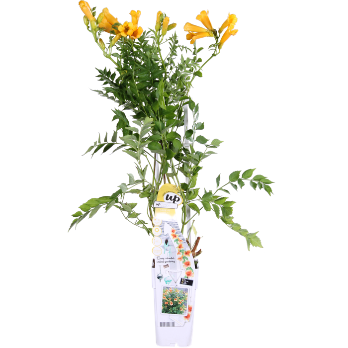 Campsis Summer Jazz Gold Trumpet’ is a Chinese trumpet that flowers abundantly and for a longer time when there is a lot of sun. The Chinese trumpet is very Hardy if placed in a sheltered spot. The yellow-flowered Campsis grows more compactly than other species in the Summer Jazz series, to a maximum height of 3 metres. The late-summer bloomer tends to form a shrub. If you want your Campsis to climb, it is useful to support it with a climbing frame at the beginning of its growth. This Campsis is a self-adhesive climber, which means that small adhesive roots are formed from the branches. These adhesive roots will attach themselves along the wall or fence. In August and September you can expect the exotic flowers that will give your outdoor area a Mediterranean atmosphere. The flowers are popular with butterflies, bees and insects.