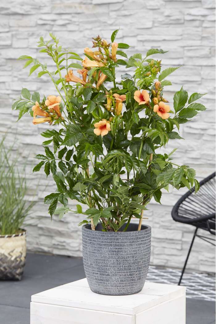 Campsis Indian Summer’ has beautiful orange Chinese trumpets and gives your garden an instant Mediterranean atmosphere. Campsis originates from America, but you will also find this climbing plant in Italy, Spain, Greece and Croatia. So there is a good chance you have come across it on holiday. Fortunately, the campsis is sufficiently winter Hardy, so you can easily bring the holiday feeling into your own garden. Place the plant in a sunny and somewhat sheltered spot. If there is a lot of sun, this Chinese trumpet will flower more abundantly and for longer. Campis flowers relatively late in the summer. This is a time when many plants have already finished flowering, making the campsis a fine addition to the garden. Campsis Indian Summer’ grows more compactly than other species. You can prune it into the desired shape in early spring. Don’t be afraid to prune it back when it gets too big and too wild. It is a strong and fast-growing plant that will suffer little from this. The campis belongs to the group of self-adhesive climbing plants. This means that they climb along a wall or fence with adhesive roots which are formed from the branches. Just like the ivy and the climbing hydrangea. You can help the campisoles at the beginning, but after that they can climb up by themselves.