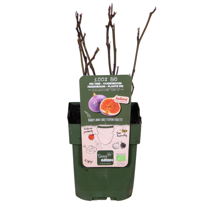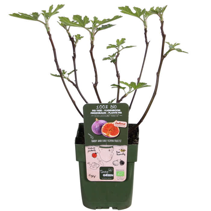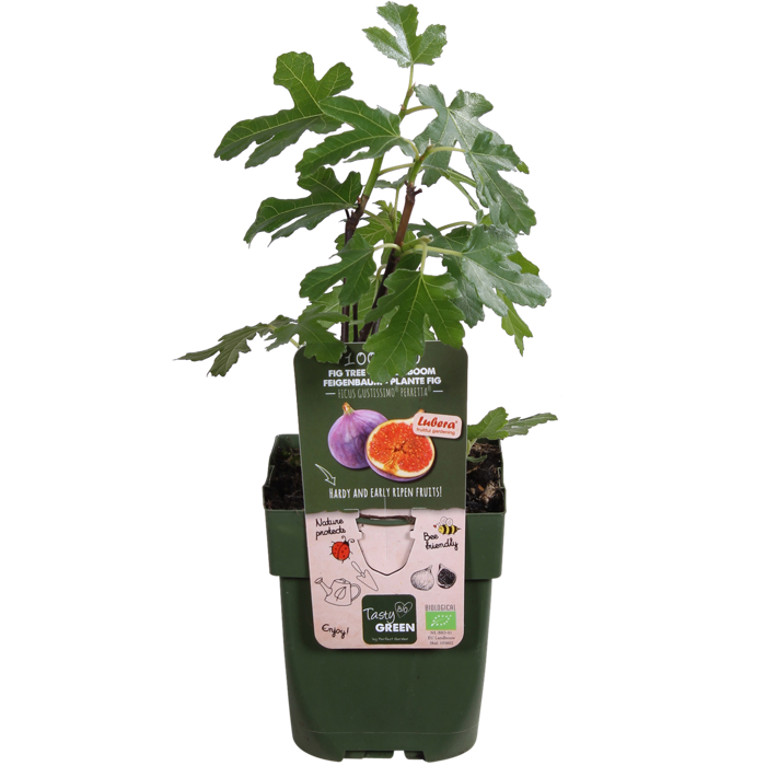 ‘Ficus Gustissimo Perretta’ is a fig tree that produces fruit twice a year and is best suited to our climate. This fig tree is extremely winter Hardy and gives your garden a Mediterranean atmosphere. The fruit has a sweet taste and can be eaten immediately after picking. The figs are green-brown with flesh that is deep red in colour. The fig has no flowers, in fact the fruits are also the flowers. The leaves of the fig tree are in the shape of a hand. The leaf of the fig tree is best known from the depiction of Adam and Eve in classical painting, where the fig leaf was used to cover the naked body. In the second year after planting, we can start harvesting in late summer. The fruits will ripen better if you protect the tree during the winter. Ficus Gustissimo Perretta’ needs a sheltered but sunny location, preferably as warm as possible. A south-facing garden, out of the wind, is therefore optimal. It is a fast grower, so if you do not prune it, it will grow to a height of several metres. This fig nests faster than most varieties. If you think the branches are getting too long, you can prune the fig.