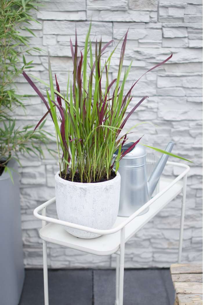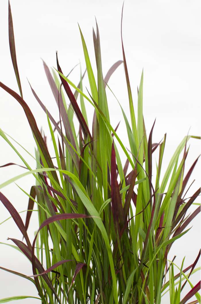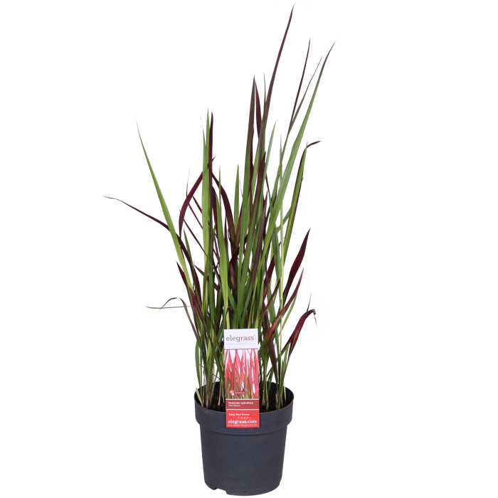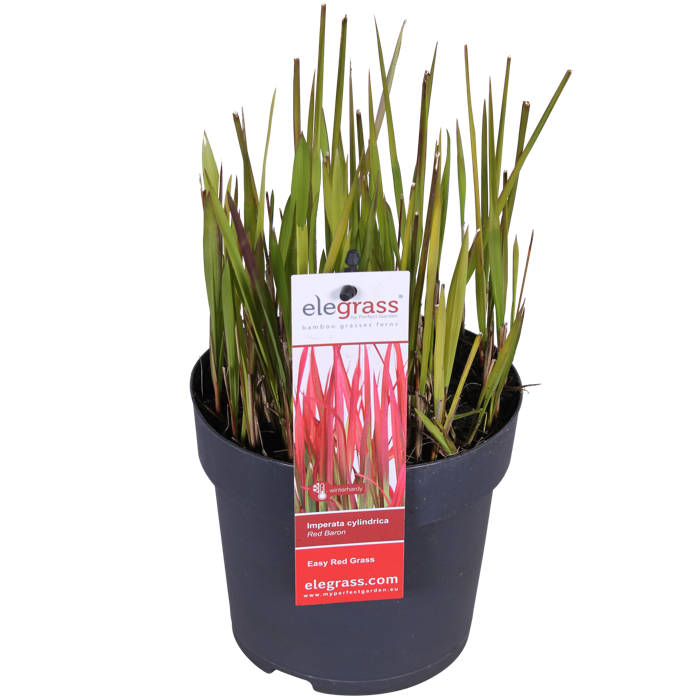 Imperata cylindrica ‘Red Baron’, syn. ‘rubra’, dutch for ‘Japanese blood grass’, is a decorative deciduous grass with a stiff upright growth and loose tussock habit. The narrow linear leaves are fresh green and turn a fiery red in summer. In other regions, Japanese bluegrass blooms from July to August with silver-grey flower spikes. Imperata cylindrica ‘Red Baron’ likes a sunny and sheltered spot in well-drained soil. This grass is drought tolerant, reasonably Hardy, tolerant to sea wind and air pollution and is a special accent plant for use in the border.