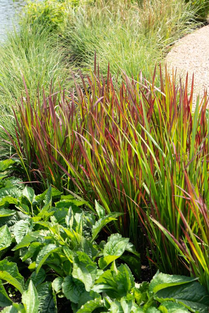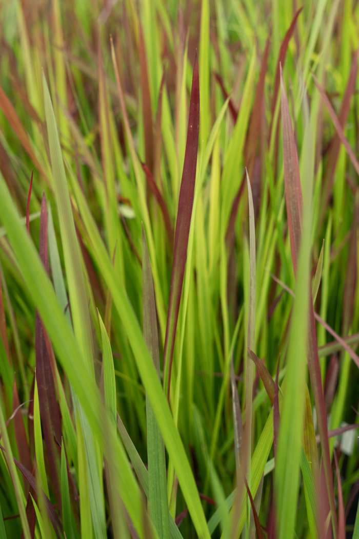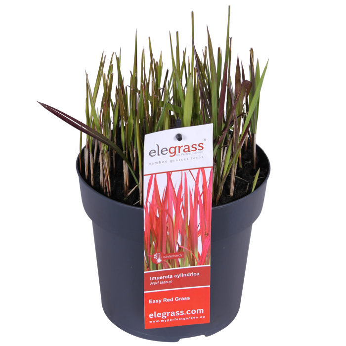 Imperata cylindrica ‘Red Baron’, also known as ‘Japanese blood grass’, is a decorative deciduous grass with a stiff upright growth and loose tussock habit. The narrow linear leaves are fresh green and turn a fiery red in summer. In other regions, Japanese bluegrass blooms from July to August with silver-grey flower spikes. Imperata cylindrica ‘Red Baron’ likes a sunny and sheltered spot in well-drained soil. This grass is drought tolerant, reasonably Hardy, tolerant to sea wind and air pollution and is a special accent plant for use in the border.