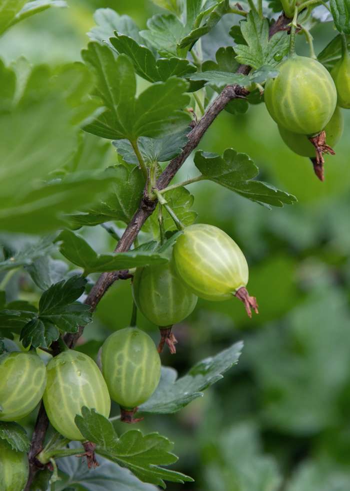 Ribes uva-crispa Hinnonmaeki Grun Green gooseberries are tasty and available in three colours, red, yellow and green. This plant exists as a free shrub or tied together with three branches. The fruits are medium-sized. The taste is fine and suitable for all purposes. This plant prefers an open, sunny spot and not in too moist soil. Ribes uva-crispa Hinnonmaeki Grun is a green gooseberry. The fruits are pale green. The plant is resistant to frost. They are bushy bushes that grow somewhat wide. The fruits are medium-sized. The taste is fine and suitable for all purposes. This plant prefers an open, sunny and not too humid soil. Be careful, however, as the plant’s thorns are very sharp. Ribes uva-crispa ‘Hinnonmaki Grön’ is a green gooseberry. The gooseberries are ripe for picking from August onwards.