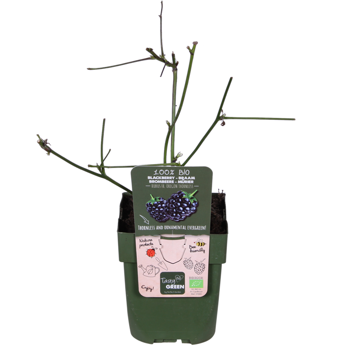 ‘Rubus Fruticosus Thornless Evergreen’ is a thornless climbingraam. There are no thorns in the way when picking the fruit, making it especially suitable for a child-friendly garden. The blackberry blooms in May and June with small white flowers. The fruits are ripe for picking from August until frost. Blackberries are first green, then they turn red and finally they take on that beautiful dark purple-black colour. They are full of minerals and sweet. The blackberry likes a sunny position. The more sun it gets, the more fruit it will bear. You can use the plant to cover a wall, climbing frame or to make a hedge. The blackberry does need help in climbing by using a wire or a climbing frame. It likes humus-rich soil. The blackberry loses its leaves in the winter. Prune regularly, both in spring and in autumn. After the harvest, the branches that have borne fruit should be pruned off completely.