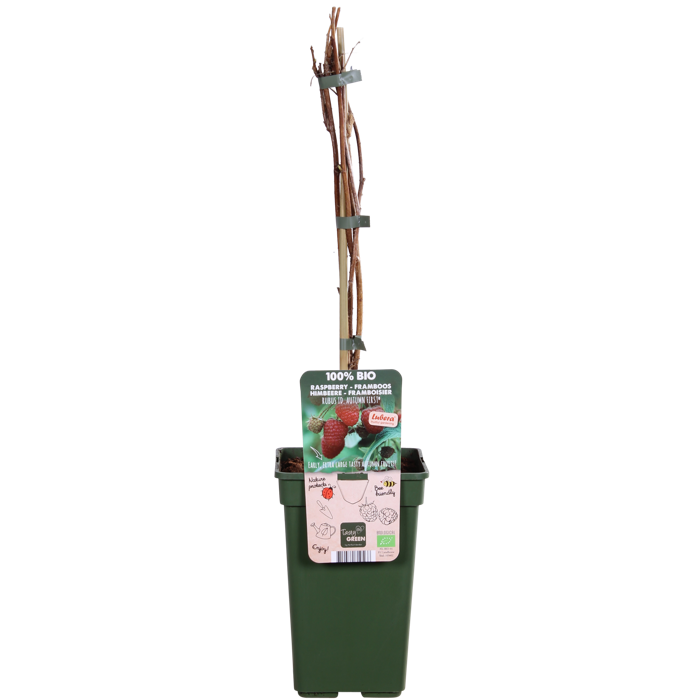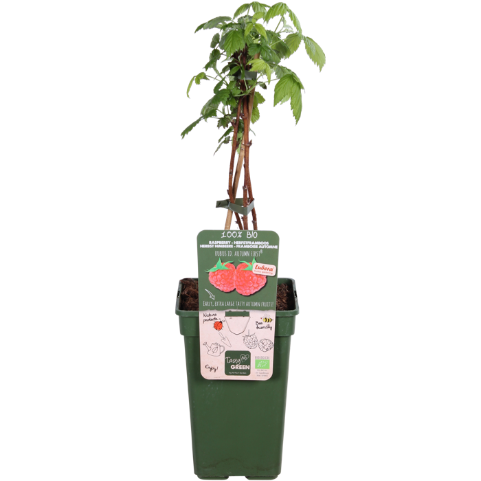 ‘Rubus Autumn First’ is an autumn raspberry and thus produces fruit in the autumn. The flowering of this shrub starts in June with white flowers, and is then richly pollinated by bees and bumblebees. At the end of August until October the fruits can be picked. The fruits are large, bright red, cone-shaped with a delicious sweet-sour taste. The raspberry can be eaten fresh, but can also be frozen or used to make delicious jam or liqueur. The fruits are very healthy, they are full of antioxidants, minerals and vitamins. This is a very productive species, so a good harvest is guaranteed! After the harvest, it is advisable to remove the branches that have borne fruit so that new young branches can grow in the new year. Rubus Autumn First’ prefers a sunny spot in a nutritious, humus-rich soil. It prefers to be placed near a mesh or fence, so that the rather weak stems of the shrub can be fastened.