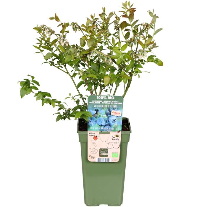‘Vaccinium corymbosum Blue Roma’ is a blueberry, also called American blueberry. It grows to a height of about 100 cm with very large and dark blue fruits. It only grows in acid soil, sandy soil and peaty soil are suitable for this plant. If you want to place the plant in clay soil, you will have to add acidic soil in order for the plant to survive. It has thin branches and small fresh-green leaves. The blueberry blooms in clusters and the flower is white-cream to pink in colour. Flowering takes place in the first half of May. It is a strong plant and gives quite a lot of fruits. The berries are large, dark blue, firm and have a delicious taste. They contain many antioxidants, so super healthy! They can be picked from mid-July to mid-August. Fresh blueberries can be kept for a week, but you can also freeze them. This plant is completely self-pollinating and requires almost no care. Protect the berries from birds with a net. The plant is Hardy and resistant to diseases.