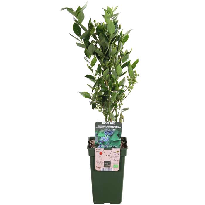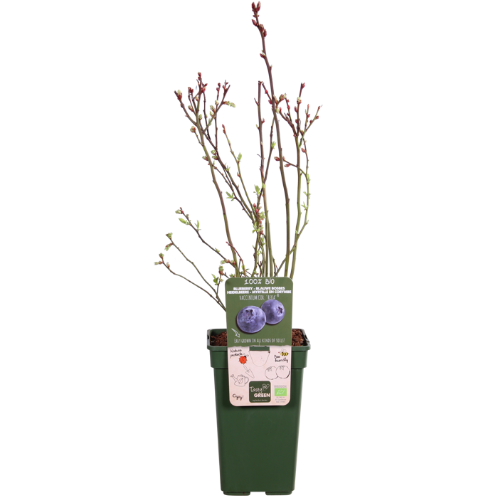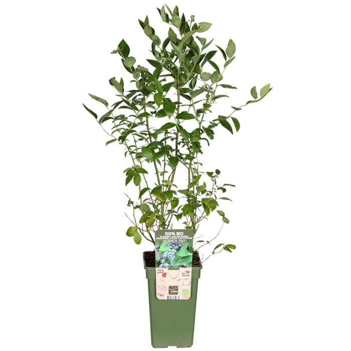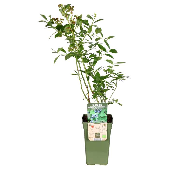 ‘Vaccinium corymbosum Reka’ is also known as blueberry. It is a well-known variety that produces many, large and sweet fruits. It grows well on any type of soil. The shrub has thin branches and small fresh green leaves. The fruits are firm, light blue with a good taste. They can be picked from mid-July to mid-August. Fresh blueberries can be kept for a week and you can also freeze them. The blueberry blooms in clusters and the flower is white-cream to pink in colour. Flowering takes place in the first half of May. This plant is completely self-pollinating and requires almost no care. The leaves have a beautiful orange-red autumn colouring and then fall off. Blueberries have medicinal properties. The berry contains anthocyanin, a substance that gives the berry its blue colour. This substance has a good effect on the heart and blood vessels. The colouring can, among other things, ensure that fat accumulation in the blood vessels is reduced, thus improving the blood circulation. In addition, blueberries contain antioxidants.