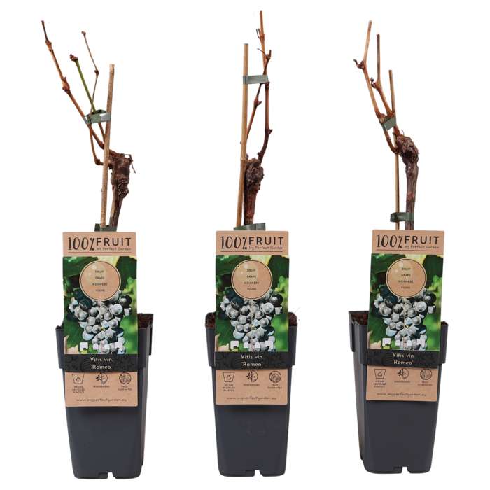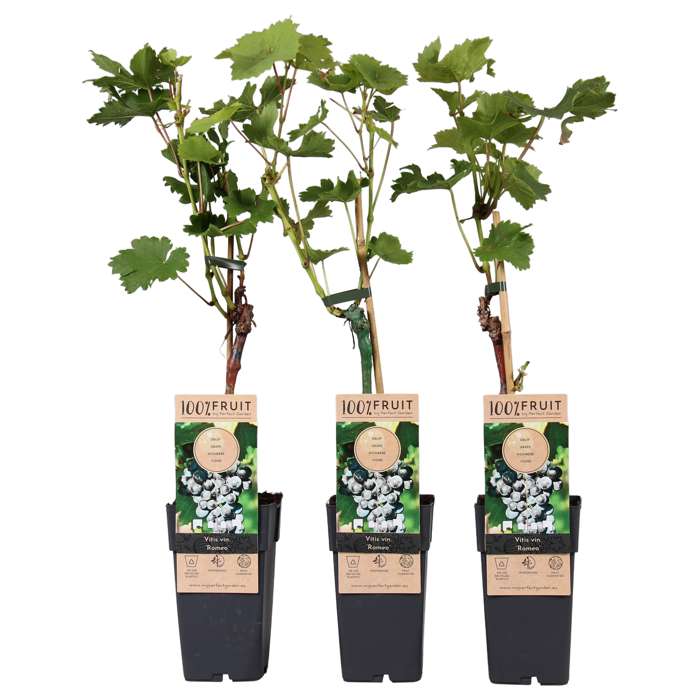 Vitis Romeo’ is a blue grape that is very resistant to diseases, but is not very well known. It is a climbing plant that can grow several metres high. You can lead it into all sorts of shapes and keep it very compact by pruning it well. You can easily lead the grape along a pergola or on a wall with tension wires. The grape first produces inconspicuous clusters of flowers in July-August, after which the grape bunches will form. The fruits are blue in colour, few seeds, with a sweet aromatic taste. You can eat them directly or use them to make jam, juice or wine. The grape plant needs plenty of sun to ripen and loves heat so a south-facing location is ideal. The grapes can be harvested from mid-September onwards. The soil should be well-drained and nutritious and preferably not too acidic, but rather calcareous. Pruning increases the fruit yield and the plant also looks neater. It is best to prune the plant in the period between November and February, but not during severe frost. Prune superfluous side and main branches. This grape variety is Hardy and can withstand temperatures up to -20 degrees without problems.