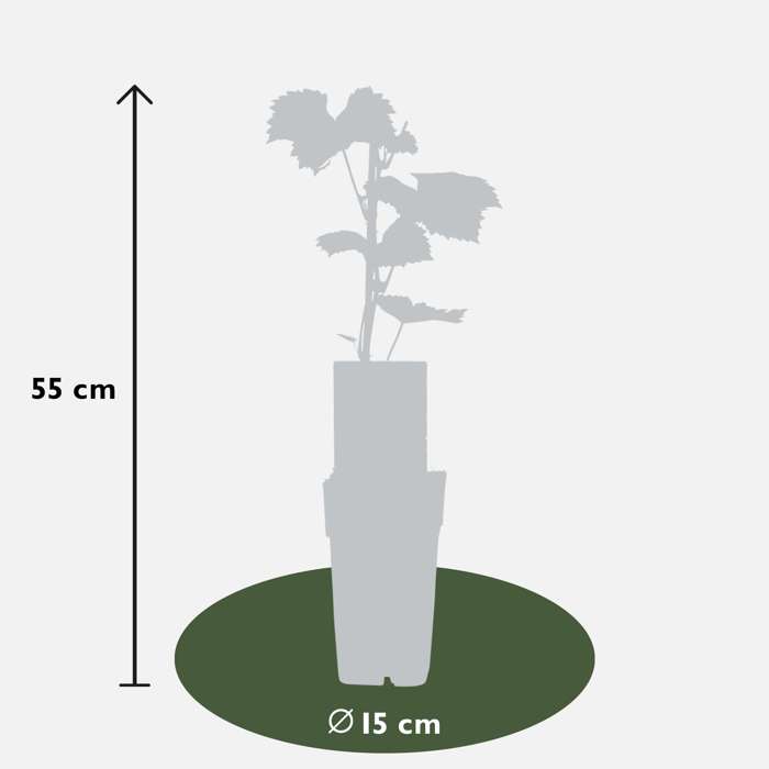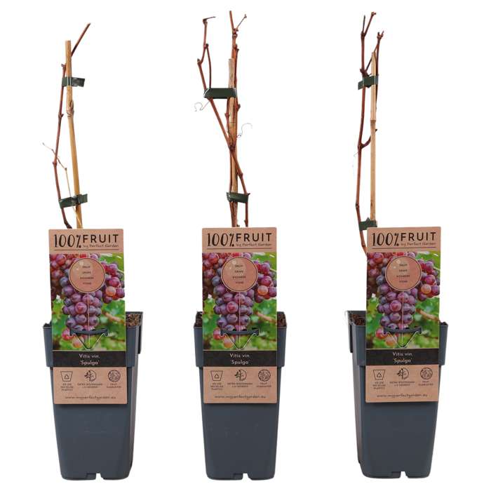 Vitis Spulga’ is a red table grape. Table grape means that the fruit is suitable for fresh consumption. It does well in cold inland areas. It is a climbing plant that can grow several metres high. You can lead it into all kinds of shapes and keep it very compact by pruning it well. You can easily lead the grape along a pergola or on a wall with tension wires. The grape first produces inconspicuous clusters of flowers in May-June, after which the grape bunches will form. The fruits are purple-red in colour, with a very sweet taste. They are therefore very suitable for making wine or jam. The grape plant needs a lot of sun to ripen and loves heat so a south-facing location is ideal. The grapes can be harvested from mid-September onwards. The soil should be well-drained and nutritious and preferably not too acidic, but rather calcareous. Pruning increases the fruit yield and the plant also looks neater. It is best to prune the plant in the period between November and February, but not during severe frost. Prune superfluous side and main branches. This grape variety is Hardy and can withstand temperatures up to -25 degrees without problems.