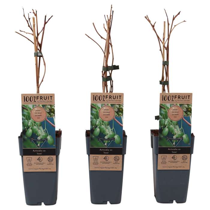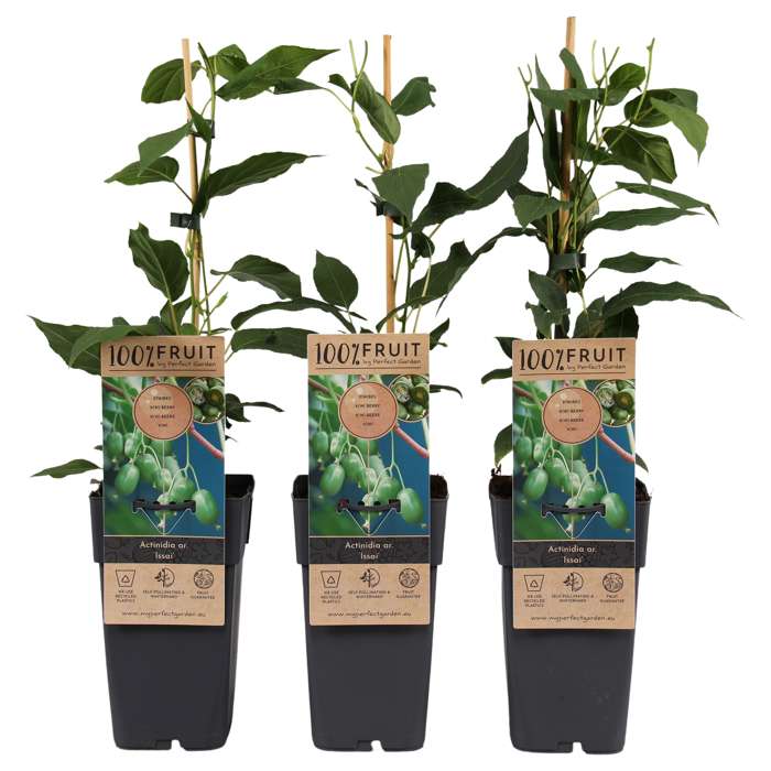 ‘Actinidia arguta Kiwiberry Issai’ is een kiwibes die al op jonge leeftijd kleine, gladde, haarloze vruchtjes geeft. Het is een zelfbestuivende plant met zowel mannelijke als vrouwelijke bloemen. Hij is ook wel bekend onder de naam mini-kiwi. De vruchten zijn zonder te schillen op te eten en rijk aan vitamine C. Ze hangen in grote trossen aan de plant, vaak gecamoufleerd tussen het blad. De opengesneden vrucht doet denken aan een miniatuur kiwi, een witte kern met daaromheen een ring van zwarte zaden en het typische lijnenpatroon. De zoete, groene bessen zijn klaar om geplukt te worden in augustus- september en zijn zo’n 2 tot 3 cm groot. Behalve vers, kunnen de vruchten ook op verschillende manieren verwerkt worden, zoals jam of compote. Ook zijn de doorgesneden vruchtjes fraai als garnering bij hapjes of desserts. De vruchten worden ook wel gedroogd en er kan zelfs wijn van worden gemaakt. De kiwibes is een klimplant en daarom kan je hem het beste helpen door hem te leiden langs een muur, klimrek of pergola. Het blad van de klimplant is langwerpig, van boven glimmend donkergroen en van onderen lichter groen. De kiwibes bloeit in juni- juli met roomwitte bloemen. Hij is volledig winterhard en kan temperaturen tot -25 °C goed verdragen. Plant de kiwiplant op een zonnige, enigszins beschutte plek.
