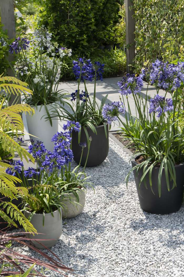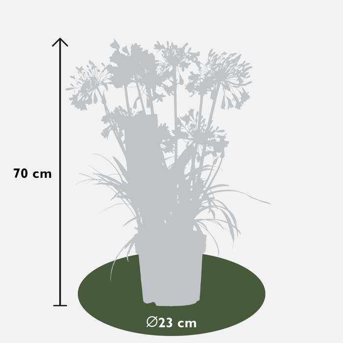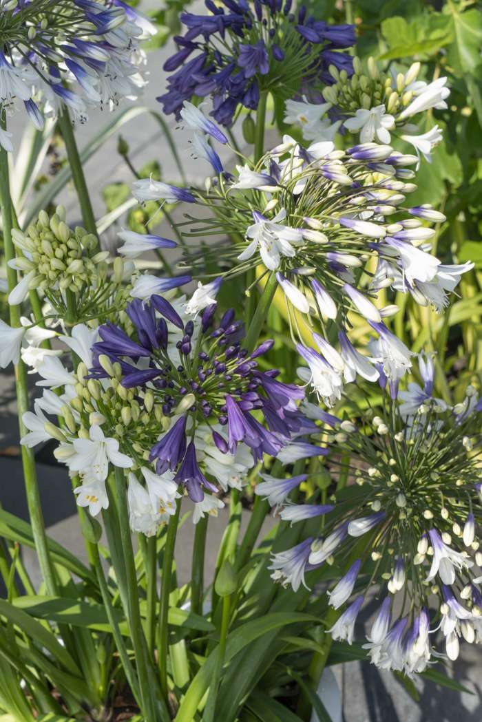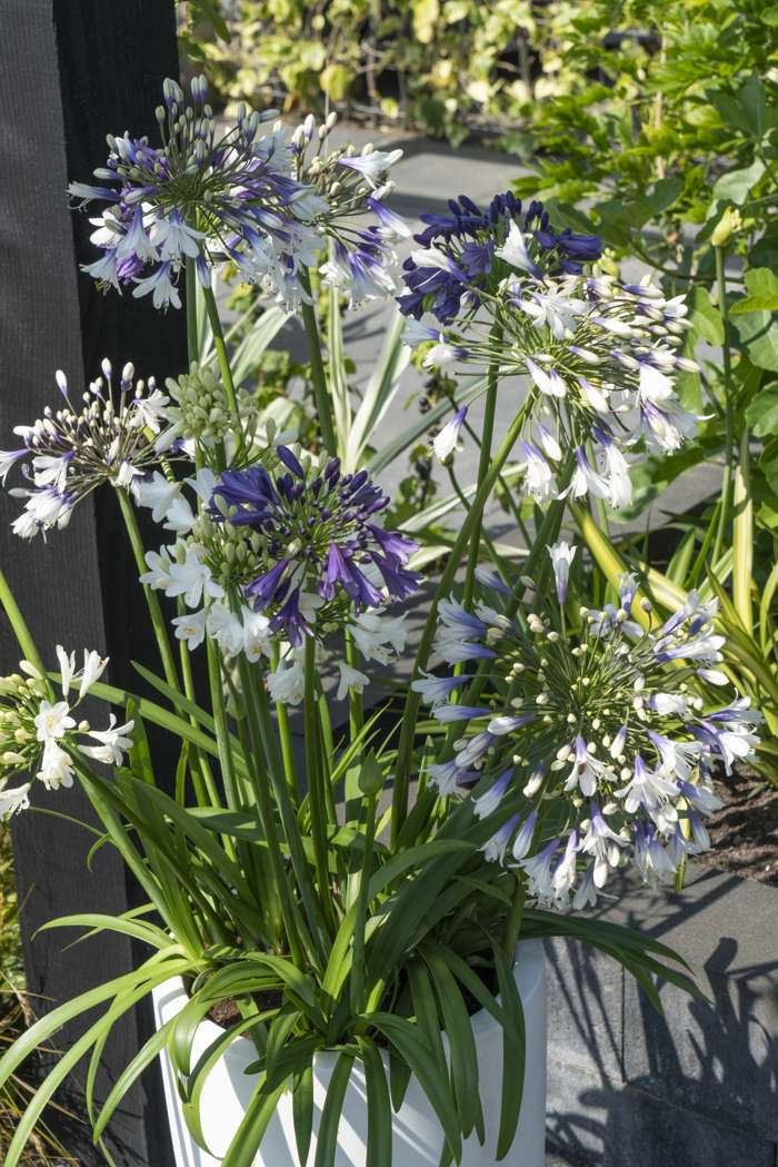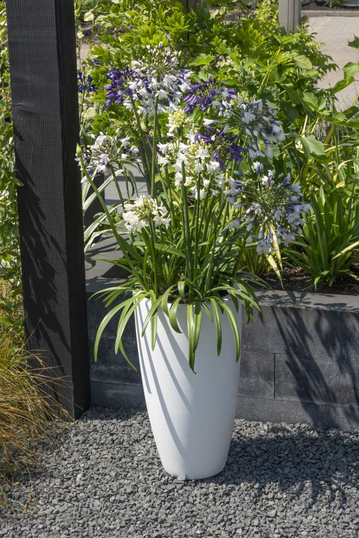 Agapanthus Three sisters heeft fantastische, bloemen in drie kleuren en geeft verrassend veel bloemstelen. Deze grote schermbloemen hebben meerdere trompetvormige bloemen die hoog op een steel staan. De bloemen van de Agapanthus bevatten een hoop nectar en worden daarom vaak bezocht door vlinders, bijen en zelfs vogels. De Agapanthus heeft een lange bloeiperiode met goede herbloei zodat je lang kunt genieten van de intens gekleurde bloemen. De Agapanthus is een zonneaanbidder, dus staat graag in de zon in een goed gedraineerde bodem. Het is een geweldige plant voor in de vaste plantenborder of voor in pot op terras of balkon. De plant hoeft niet gesnoeid te worden, alleen bladeren die geel geworden zijn kan je afknippen. Na de bloei kan je de overgebleven bloemstengels eventueel verwijderen. De plant is goed winterhard tot wel -12 graden en kan dus makkelijk de winter in Nederland overleven.