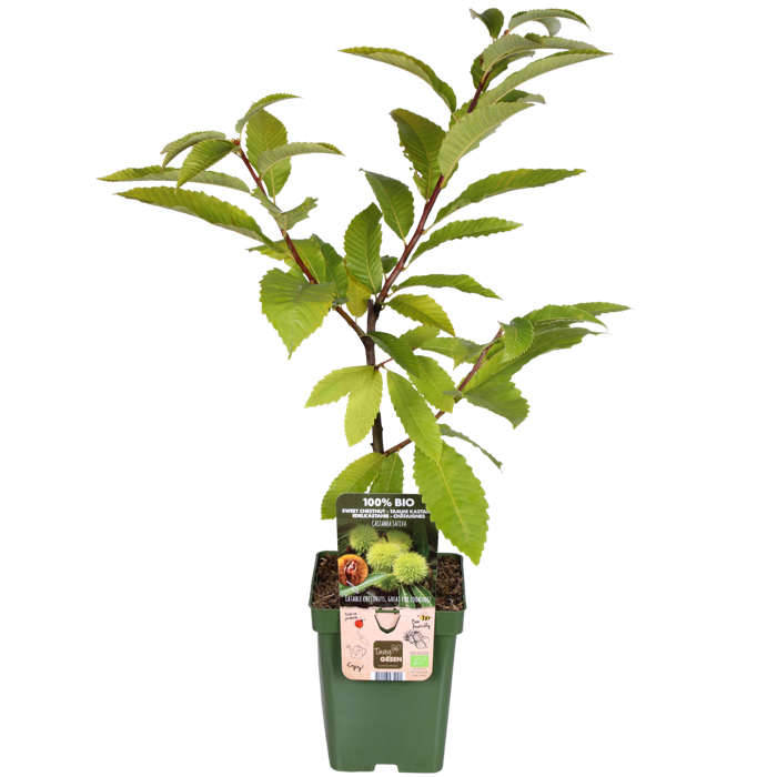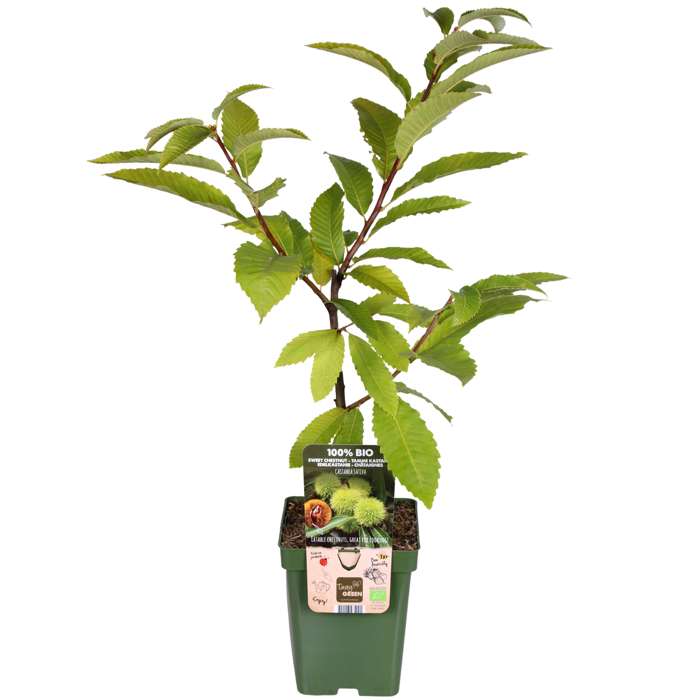 ‘Castanea Sativa’ is een grote tamme kastanjeboom met een brede kroon. De boom kan wel 400 jaar oud worden. De hoogte van de stam van de boom is ongeveer 200 cm, daarboven beginnen de takken. De stam is gedraaid en heeft een bast vol groeven en spleten. Jonge takken zijn olijfgroen maar kleuren daarna roodbruin. Het langwerpige blad is donkergroen, glimmend met een gekartelde bladrand. Jonge bladeren zijn aan de onderzijde behaard. De vruchten zijn glanzende bruine noten. Er zitten twee tot vier stuks bijeen in harde, geelbruine, stekelige buitenkant. De tamme kastanjes die in de herfst van de kastanjeboom vallen zijn eetbaar. Nadat je de kastanje hebt ontdaan van hun bruine schil kan je ze rauw eten, poffen, roosteren of koken. Kastanjes zijn een stuk minder vet dan andere noten. Er zitten wel de nodige koolhydraten, vezels en eiwit in.