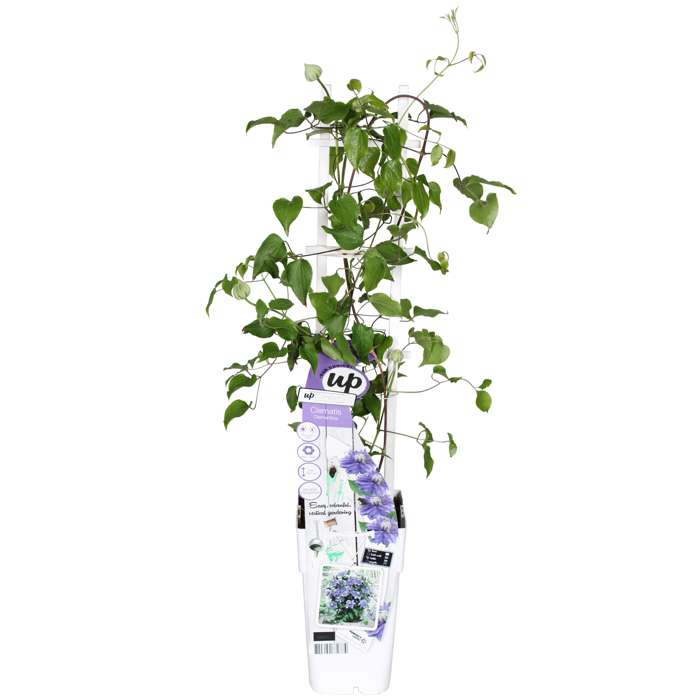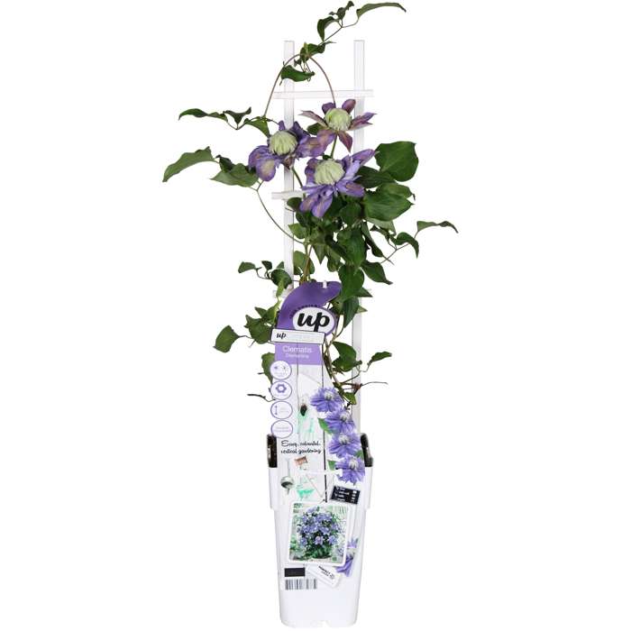 ‘Clematis Diamantina’ is een bosrank met dik gevulde paarse bloemen. Elke afzonderlijke bloem bloeit tot wel 4 weken. De bloemen ontvouwen zich mooi vanuit een centrale bal en creëren zo een elegante, meer pom-pom. De bloei is in twee periodes, eerst in de late lente tot midden zomer en dan in de late zomer tot in de vroeg herfst. Deze compacte grootbloemige clematis is ideaal voor kleine tuinen of voor in een pot op het balkon of terras. Het is een klimplant die wat hulp nodig heeft bij het klimmen. Het beste kun je de plant dan ook langs een rek, draad of stok omhoog leiden. De clematis doet het zowel in de halfschaduw als in de zon erg goed. Dit maakt de clematis geschikt voor de meeste plekken in je tuin. Bij meer zon zal de clematis wel rijkelijker bloeien. Snoeien is niet noodzakelijk. Verwijder echter wel de dode en beschadigde twijgen begin maart. Je kan deze Clematis in het voorjaar tot maximaal 20 centimeter boven de grond terug snoeien.