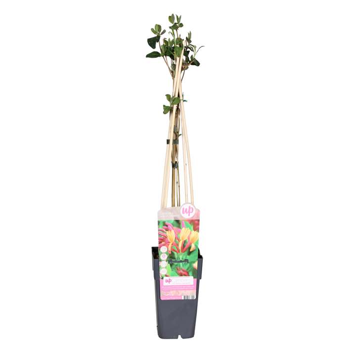 ‘Lonicera heckrottii Goldflame’ is een bladverliezende Kamperfoelie die vanaf juni begint te bloeien met heerlijk geurende rood oranje buisvormige bloemen. Deze Kamperfoelie kan de gehele zomer doorbloeien met zijn prachtige kleurrijke bloemen. De gekleurde bloemen trekken vlinders en bijen aan. De Lonicera kan het best geplant worden bij een pergola muur of schutting omdat hij wel hulp nodig heeft om omhoog te groeien. Deze mooie klimmer kan tot een hoogte en breedte van 4 tot 6 meter komen. Snoeien kan het best worden gedaan in het vroege voorjaar. Snoei dan de oude en beschadigde takken van de klimplant in tot de gewenste hoogte, dit stimuleert de plant met het zetten van nieuwe jonge scheuten. Deze Kamperfoelie staat graag op een plekje in de zon tot half schaduw in een goede humus rijke grond.