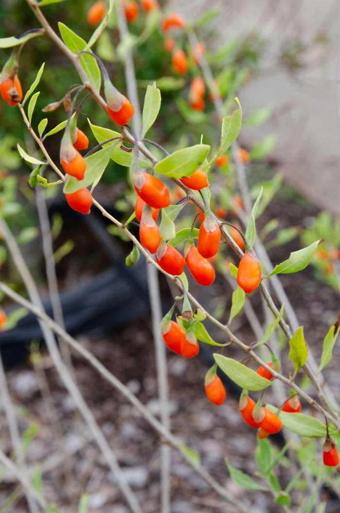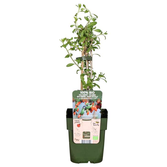 ‘Lycium barbarum Gojiberry’ is een gojibes en komt oorspronkelijk uit China. Het is een struikvormige plant die verse en gezonde vruchten geeft. De bessen zijn zeer geneeskrachtig en hebben een goede invloed op de gezondheid. Volgens de traditionele Chinese geneeskunde zou het regelmatig eten van de goji bes de jeugdigheid in het lichaam vasthouden. Het is dus niet voor niks een superfood plant. De bessen worden gebruikt voor het maken van sap, jam, gelei of kunnen worden ingedroogd als krenten. De smaak van goji krenten is wat frisser dan die van rozijnen en krenten. Zorg ervoor dat de kluit van ‘Lycium barbarum’ voor het planten goed vochtig is. Zet de struik eerst in een emmer lauwwarm water en vervolgens in de grond. De gojibes groeit goed in elke zanderige grond die goed water doorlatend is. Geef de struik een plekje in de volle zon of lichte schaduw. De plantafstand tussen de struiken moet ongeveer 1 tot 1,5 meter zijn. De winterhardheid van de gojibes is zeer hoog en is dus prima te houden in ons klimaat.
