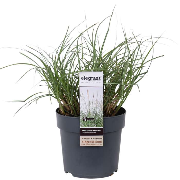 ‘Miscanthus sinensis Yakushima Dwarf’, in het Nederlands ook wel prachtriet genoemd, is een siergras met opgaande groei. De ‘Yakushima Dwarf’ blijft wat lager dan de meeste ‘Miscanthus’ soorten. De hoogte van deze plant is tussen de 80 en 100 cm. Hij heeft een smal grijs-groen blad met een witte middennerf. Dit prachtriet bloeit in augustus en september met beige-witte pluimen die later verkleuren naar lichtbruin. De pluimen steken sierlijk boven het blad uit en geven jouw tuin net iets extra’s. Hij houdt van een zonnige plek op een waterdoorlatende bodem. Laat de bladeren en stengels ook in de winter aan het blad zitten en snoei dus pas in het vroege voorjaar. Het snoeien kan tot 10 cm boven de grond. De takken beschermen de plant in de winter tegen invriezen.