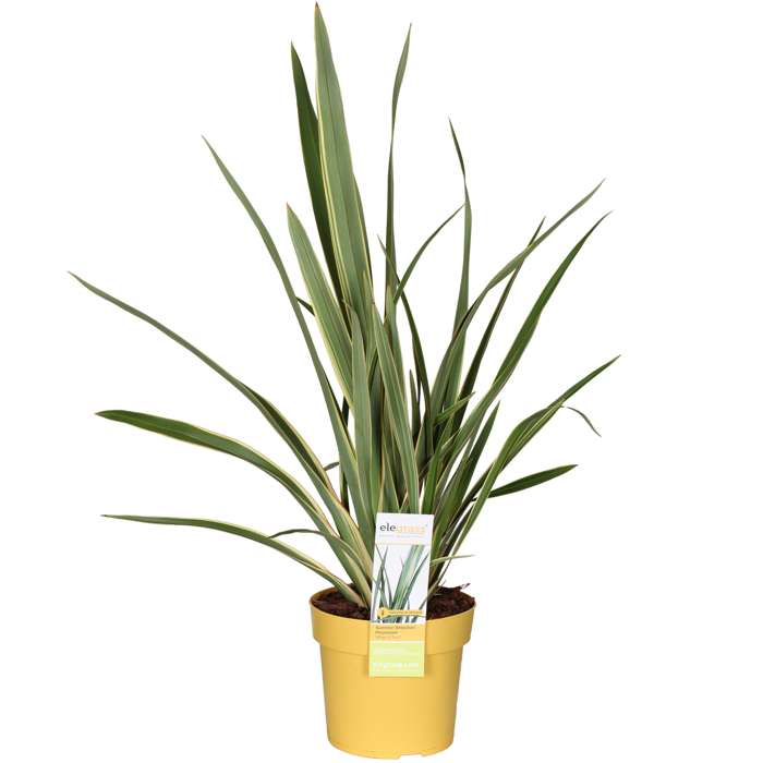 ‘Phormium tenax Wings of Gold’, in het Nederlands Nieuw Zeelands vlas genoemd, is een groenblijvende exotische plant en heeft kenmerkende stijve en zwaardachtige bladeren. De rechtopstaande bladeren zijn groen met een gele streep aan de buitenrand. Na enkele jaren kan deze Phormium bloeien met opvallende hoge bloempluimen en buisvormige, donkerrode bloempjes tijdens de maanden juli en augustus. Helaas bloeit de plant in ons zeeklimaat zelden. De Phormium is winterhard en groenblijvend en daardoor een kleurrijke toevoeging aan jouw wintertuin. Deze plant is makkelijk in onderhoud en is hitte en droogte resistent. De Phormium komt het beste tot zijn recht als blik vangende solitair, maar doet het ook goed in groepen. De plant hoeft niet gesnoeid te worden maar je kan wel de dode bladeren weg knippen. De Phormium staat het best op een beschutte plek in droge tot vochthoudende, voedselrijke grond in de volle zon of lichte schaduw.