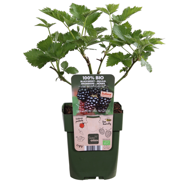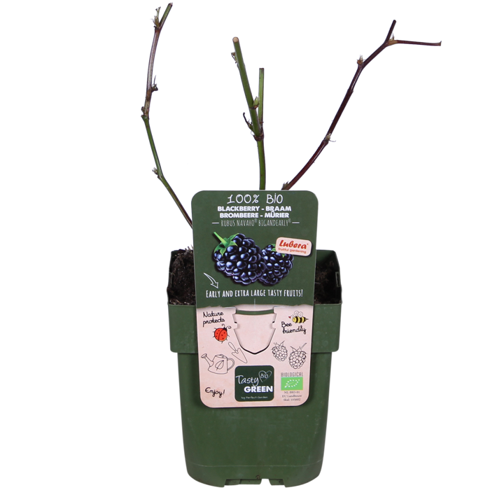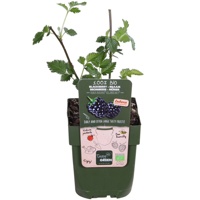 ‘Rubus Navaho Bigandearly’ is een productief en gezond bramen soort. Het grote voordeel van deze braam is de robuuste opgaande groei. De takken worden minder lang en zijn goed stevig hierdoor kan je de braam goed neerzetten in een kleine tuin of op een balkon. De bramenstruik geeft al vanaf eind juli grote, sappige diepzwarte bramen. Alle bramen houden van een zonnig, licht plekje en goede lucht en vocht doorlatende grond. De bramenstruik heeft steun nodig bij het groeien, daarom is het handig om de stengels langs een klimelement of gaas te binden. Snoei de takken af die dit jaar vrucht hebben gegeven. Dan houd je de struik jong en komen er genoeg nieuwe vruchten het volgende jaar. Bramen bevatten veel mineralen en anthocyanen. Van alle fruitsoorten bevatten bramen de meeste vitamine E en zijn bramen het rijkst aan calcium, tevens leveren ze ook veel ijzer en magnesium. Deze mineralen zijn nodig voor onze spieren, botten en bloed.