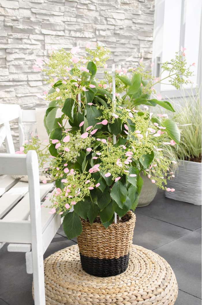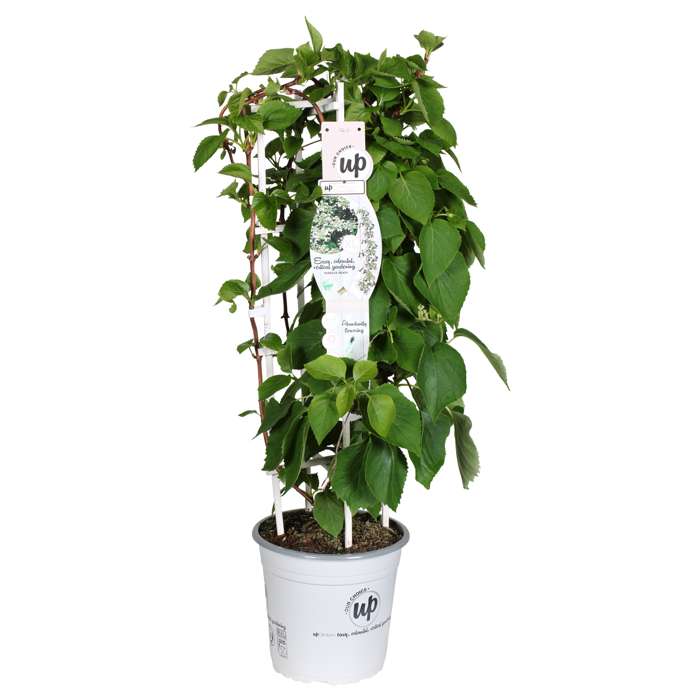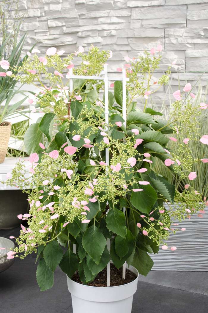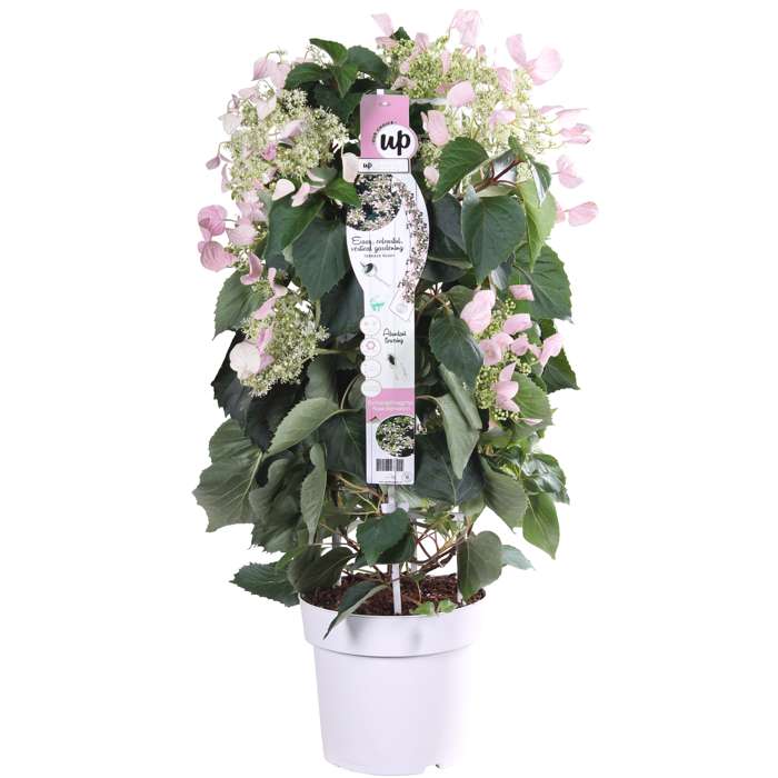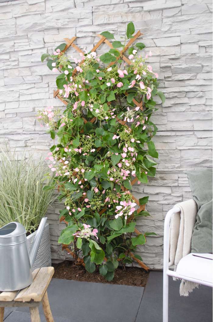 Schizophragma hydr. Rose Sensation’ is inderdaad een ware sensatie. Het is een snelle groeier en van juni tot augustus zeer rijk bloeit. De bloemen zijn helder roze en de bloemschermen hebben een diameter van 15-20 cm. De bladeren zijn groot, donkergroen, getand, hartvormig en gepunt. De plant wordt ongeveer 4-10 m hoog en 3-5 m breed. Je kunt de Schizophragma toepassen als klimplant tegen een muur, schutting of pergola maar ook op terras- of balkon met een klimhulp. Deze heester kan indien gewenst na de bloei worden gesnoeid. Plant de Schizophragma in de halfschaduw of schaduw in een goed doorlatende, vruchtbare en vochtige grond. Winterhard tot -15 ºC en zelfhechtend. Deze plant kan ook redelijk tegen zeewind, lokt bijen en vlinders en is vrij goed ziekteresistent en ongediertevrij. De plant is zeer goed geschikt als muurbeplanting of bodembedekker.