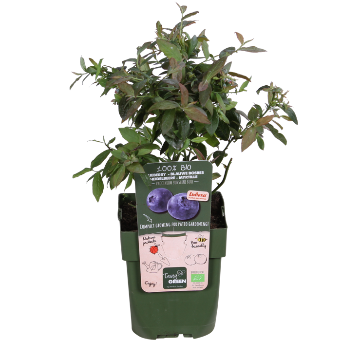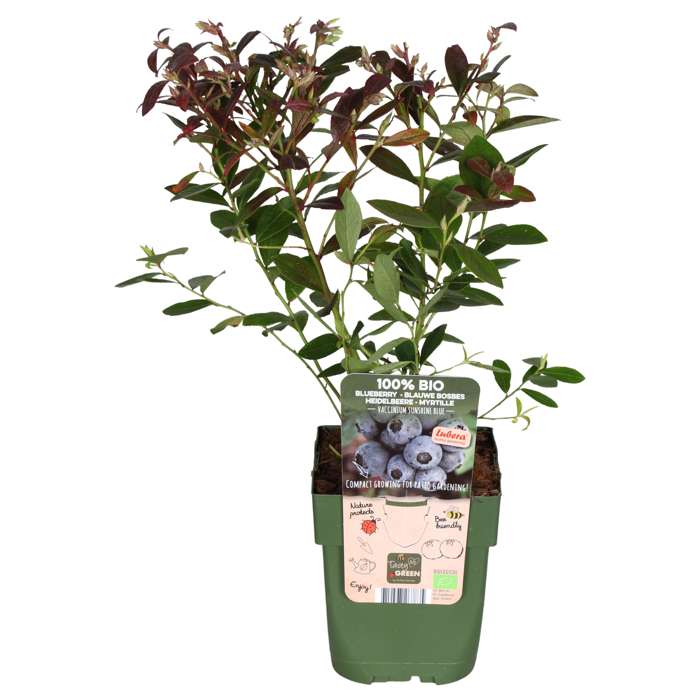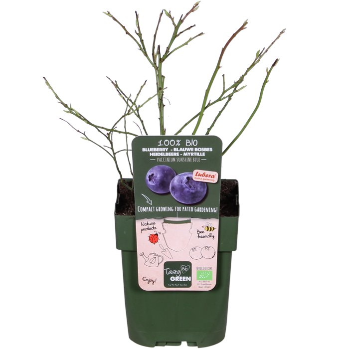 ‘Vaccinium corymbosum Sunshine Blue’ ook wel blauwe bes of Amerikaanse bosbes genoemd. Het is een een compacte bosbes, de plant wordt maar zo’n 80 cm hoog. De bessen hebben een lekkere frisse smaak en een prachtige hemelsblauwe kleur. Je kan ze gelijk van de struik eten, maar ook zeer geschikt voor verwerking in jam, taart of sap. De plant staat het liefst op een zonnige/halfschaduw plek en heeft een zure grond nodig om te kunnen groeien. Anders zal de plant maar weinig vrucht geven of hij kan zelfs doodgaan. De bosbes bloeit in mei roze met rode knoppen die daarna veranderen in bessen. Het begin van de pluktijd is in juli. De bosbes blijft ook in de winter groen en verliest dus niet zijn blad. Hij is daardoor minder winterhard dan bladverliezende soorten, en zal op een meer beschutte plaats neergezet moeten worden. De blauwe bessen bevatten anthocyaan, een stof die de bes zijn blauwe kleur geeft. Deze stof heeft een goede werking op hart- en bloedvaten. De kleurstof kan er onder andere voor zorgen dat vetophoping in de bloedvaten wordt verminderd, hierdoor wordt de doorbloeding van de bloedvaten beter. Daarnaast bevatten blauwe bessen antioxidanten. Deze spelen een belangrijke rol bij het verouderingsproces. Kortom, een super gezonde bes die iedereen in zijn tuin wil!