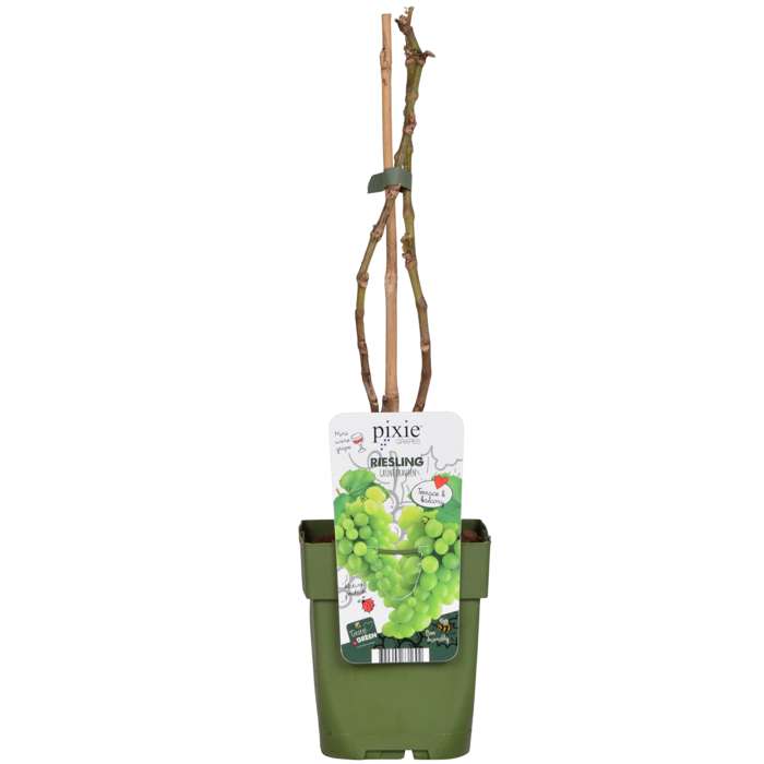 ‘Riesling’ is een wit druivenras. Riesling wijn staat bekend om zijn aromatische kracht, variërend van strakdroog tot volzoet met altijd duidelijk waarneembare fijne zuren. Vitis Pixie Grape is een dwergdruif die kleine trossen druiven produceert, een gemiddelde tros is 10 cm groot. De Pixie Grape is een van nature voorkomende mutant van Vitus Vinifera ‘Pinot Meunier’, een druivensoort die wordt gebruikt om wijn en champagne te produceren. In tegenstelling tot traditionele wijnstokken waarbij het tot drie jaar kan duren om druiven te produceren, begint de Pixie-druif in het eerste jaar al de kleine druiven te produceren. De druif heeft doordat hij compact is een unieke uitstraling en is extra leuk voor de wijnliefhebber. Deze dwergwijnstokken hebben korte stengels en geven de voorkeur aan bloemen in plaats van ranken. Ze zijn slechts 30 tot 50 cm hoog, daardoor is de Vitis Pixie makkelijk te kweken in kassen of op het balkon of terras. Deze plant is makkelijk te verzorgen dus ook geschikt voor de minder ervaren tuinier.