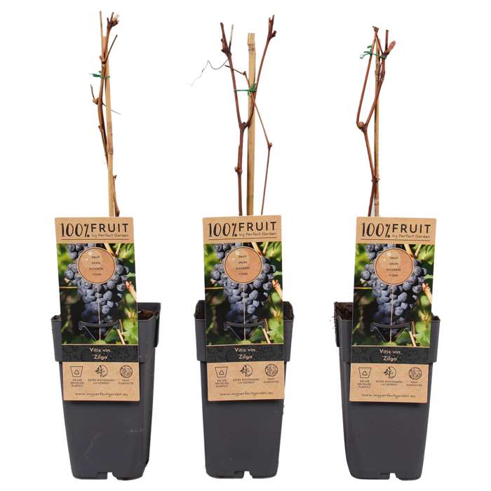 ‘Vitis Zilga’ is een sterk groeiende en productieve Letse blauwe druiven soort. Het is een klimplant die enkele meters hoog kan worden. Je kunt hem zelf in allerlei vormen leiden en door goed te snoeien zeer compact houden. Je kan de druif goed leiden langs een pergola of met spandraden op de muur. De druif geeft in de periode mei- juni eerst onopvallende trosjes bloemen, waarna de druiventrossen zullen vormen. De vruchten zijn blauw, met een zoete aromatische smaak. De smaak doet denken aan bosbessen. Je kan ze direct opeten of gebruiken voor jam, sap of het maken van wijn. De druiven kunnen gebruikt worden voor rosé wijn. De druivenplant heeft veel zon nodig om te kunnen rijpen en houdt van warmte waardoor een plek op het zuiden ideaal is. De druiven kunnen vanaf midden september geoogst worden. De bodem dient goed doorlatend en voedzaam te zijn en het liefst niet te zuur, eerder kalkrijk. Door snoeien vergroot je de vrucht opbrengst en de plant ziet er ook netter uit. Het beste snoei je de plant in de periode tussen november en februari, maar niet tijdens strenge vorst. Snoei dan overbodige zij en hoofdtakken weg. Deze druivensoort is zeer winterhard en kan temperaturen tot -40 graden prima aan. De grote bladeren hebben een mooie rode kleur in de herfst, ook dan heeft de plant een grote sierwaarde.
