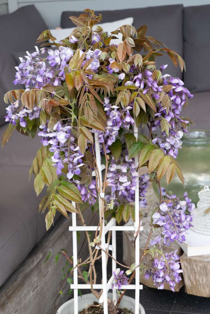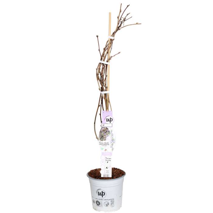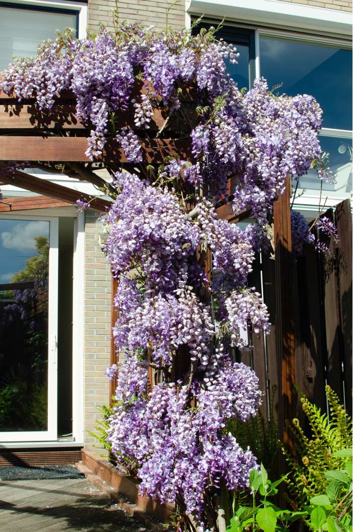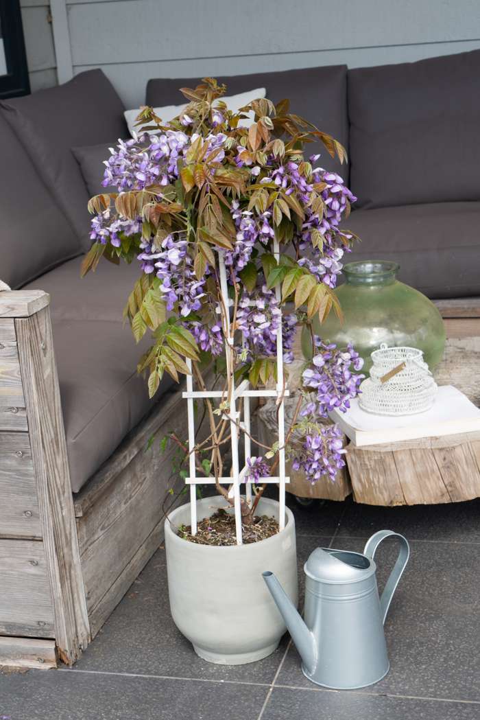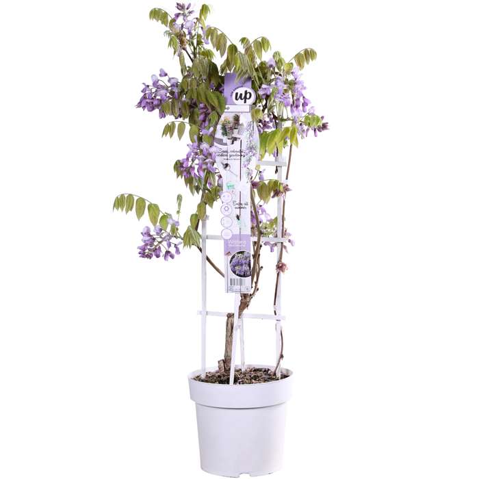 ‘Wisteria Blue Waterfall’ ook wel bekend als blauwe regen is een klimplant met mooie, zeer lange, lavendelblauw kleurige bloemtrossen die massaal verschijnen in mei- juni. Er kan in september ook nog een nabloei plaatsvinden. Dit soort blijft compact en is daarom perfect voor op het balkon of he terras. Door zijn rijke bloei is het de ultieme blikvanger. Om de wisteria het mooist in vorm te houden kun je hem het beste langs een pergola, schutting of rek leiden. Zorg daarbij voor stevige steun, waaraan de takken bevestigd worden en hij naar de zon kan klimmen. Daarnaast is het belangrijk de plant regelmatig terug te snoeien tijdens de groei of in het vroege voorjaar. Snoei liefst tweemaal per jaar. Knip in het vroege voorjaar, wanneer de plant zonder blad is, alle overbodige takken weg tot zo’n drie ogen. Uit de ogen op de zijtakken zullen later namelijk de bloemen verschijnen. In de zomer wanneer de plant volop aan het groeien is dan kun je het beste de lange uitlopers in de door jou gewenste richting leiden. Wanneer je deze niet nodig hebt kun je deze het beste verwijderen. Wanneer je de Wisteria een zonnige standplaats geeft zal deze nog rijkelijker bloeien. Bij een goede verzorging kan de blauwe regen zelfs honderden jaren oud worden.