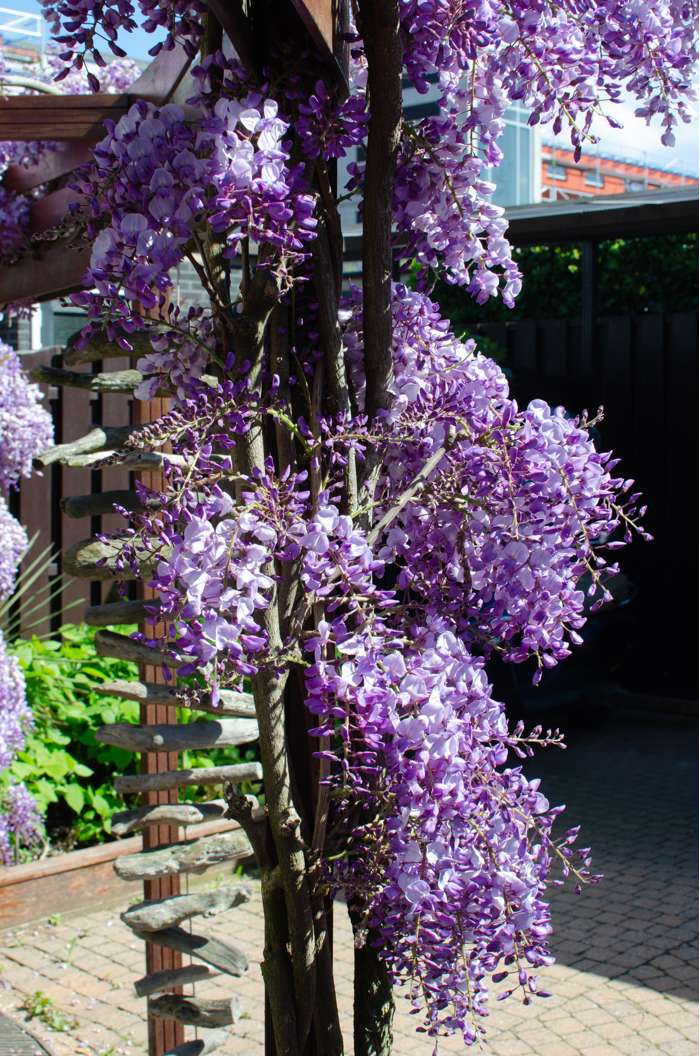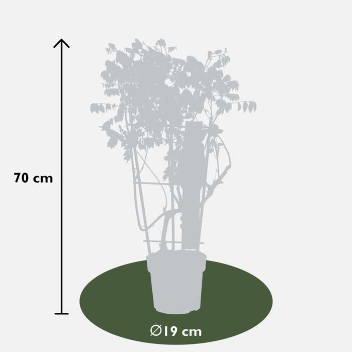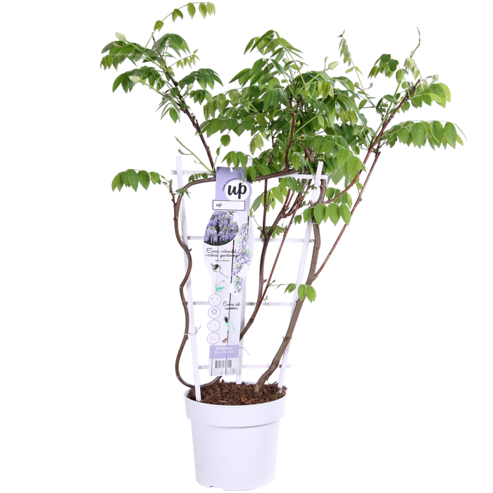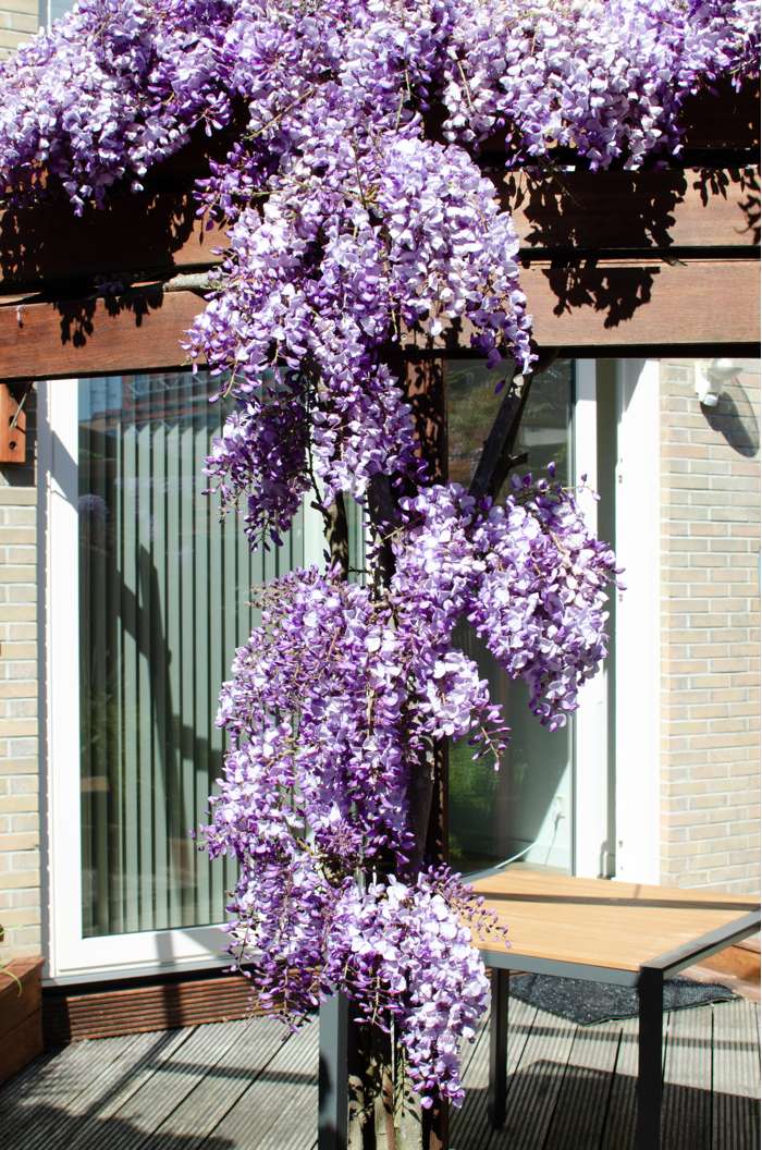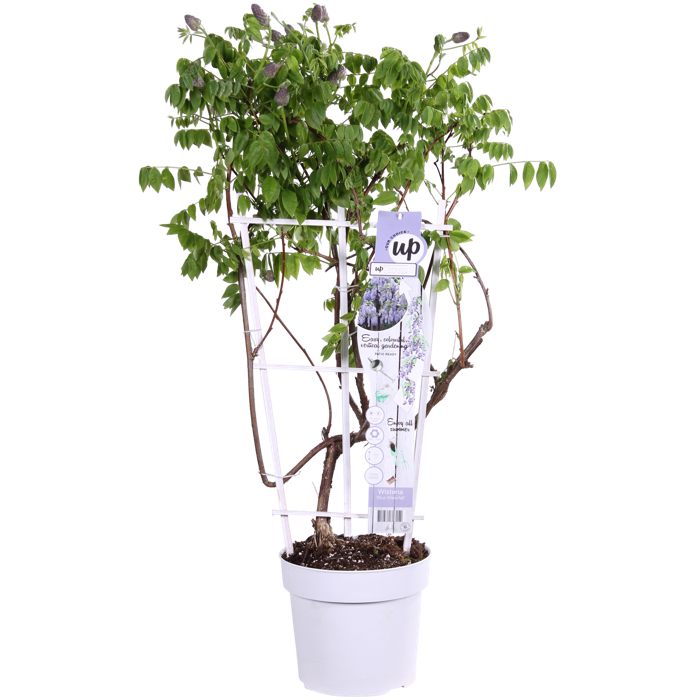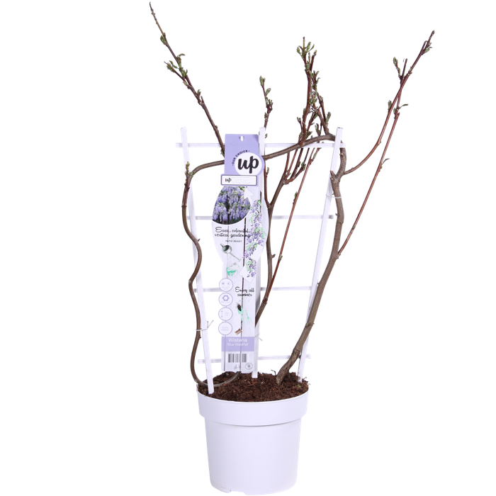 ‘Wisteria Blue Waterfall’ ook wel bekend als blauwe regen is een klimplant met mooie, zeer lange, lavendelblauw kleurige bloemtrossen die massaal verschijnen in mei- juni. Er kan in september ook nog een nabloei plaatsvinden. Dit soort blijft compact en is daarom perfect voor op het balkon of he terras. Door zijn rijke bloei is het de ultieme blikvanger. Om de wisteria het mooist in vorm te houden kun je hem het beste langs een pergola, schutting of rek leiden. Zorg daarbij voor stevige steun, waaraan de takken bevestigd worden en hij naar de zon kan klimmen. Daarnaast is het belangrijk de plant regelmatig terug te snoeien tijdens de groei of in het vroege voorjaar. Snoei liefst tweemaal per jaar. Knip in het vroege voorjaar, wanneer de plant zonder blad is, alle overbodige takken weg tot zo’n drie ogen. Uit de ogen op de zijtakken zullen later namelijk de bloemen verschijnen. In de zomer wanneer de plant volop aan het groeien is dan kun je het beste de lange uitlopers in de door jou gewenste richting leiden. Wanneer je deze niet nodig hebt kun je deze het beste verwijderen. Wanneer je de Wisteria een zonnige standplaats geeft zal deze nog rijkelijker bloeien. Bij een goede verzorging kan de blauwe regen zelfs honderden jaren oud worden.